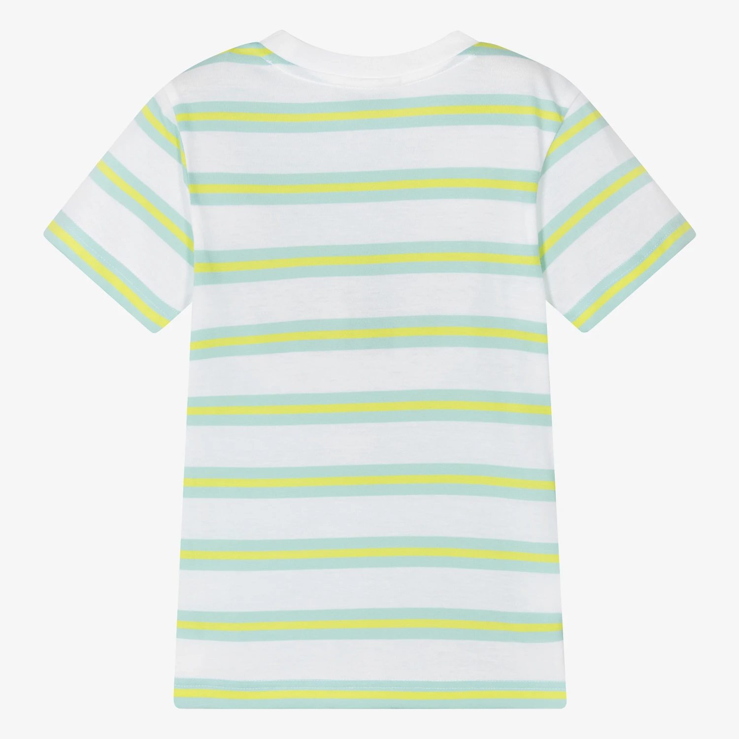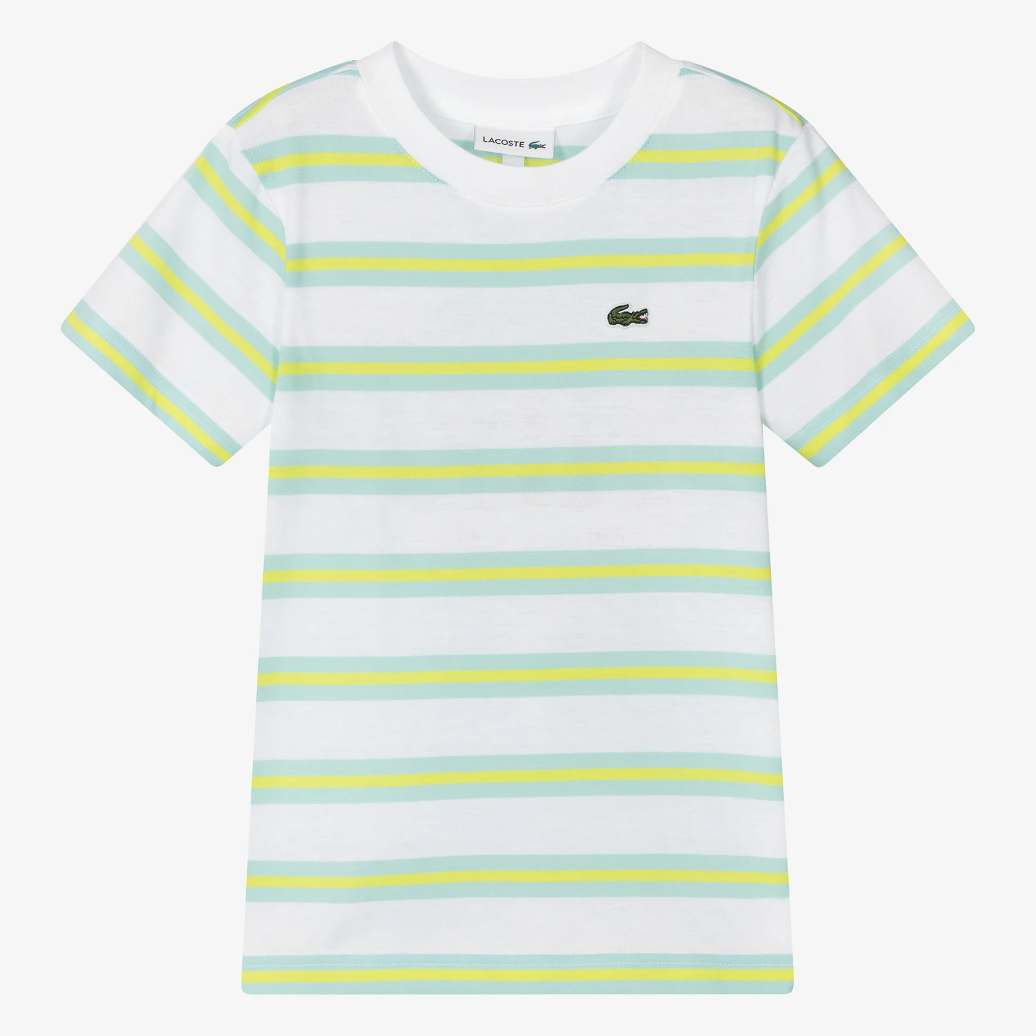 Casual white T-shirt for boys by Lacoste, with green and yellow stripes. It has the designer’s iconic crocodile logo on the chest for a signature look. Made in soft cotton jersey with a gently ribbed crew neck, it is easy and comfortable to wear.