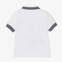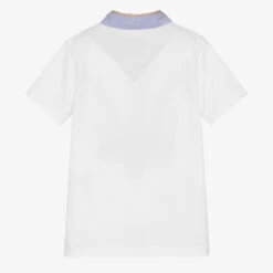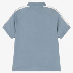 Boys grey polo shirt from Lapin House, with a cycling themed logo pattern. Made in soft cotton jersey, it has a contrast collar in blue Oxford cotton, with embroidered trim and a branded silver stud.