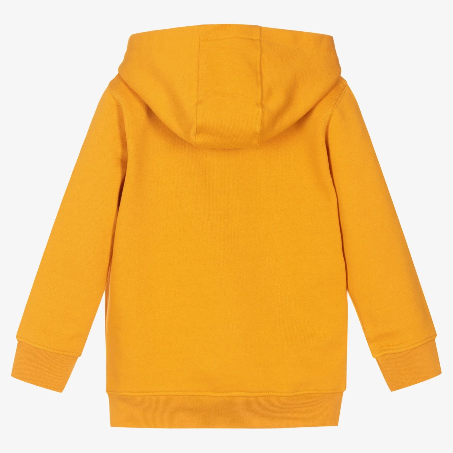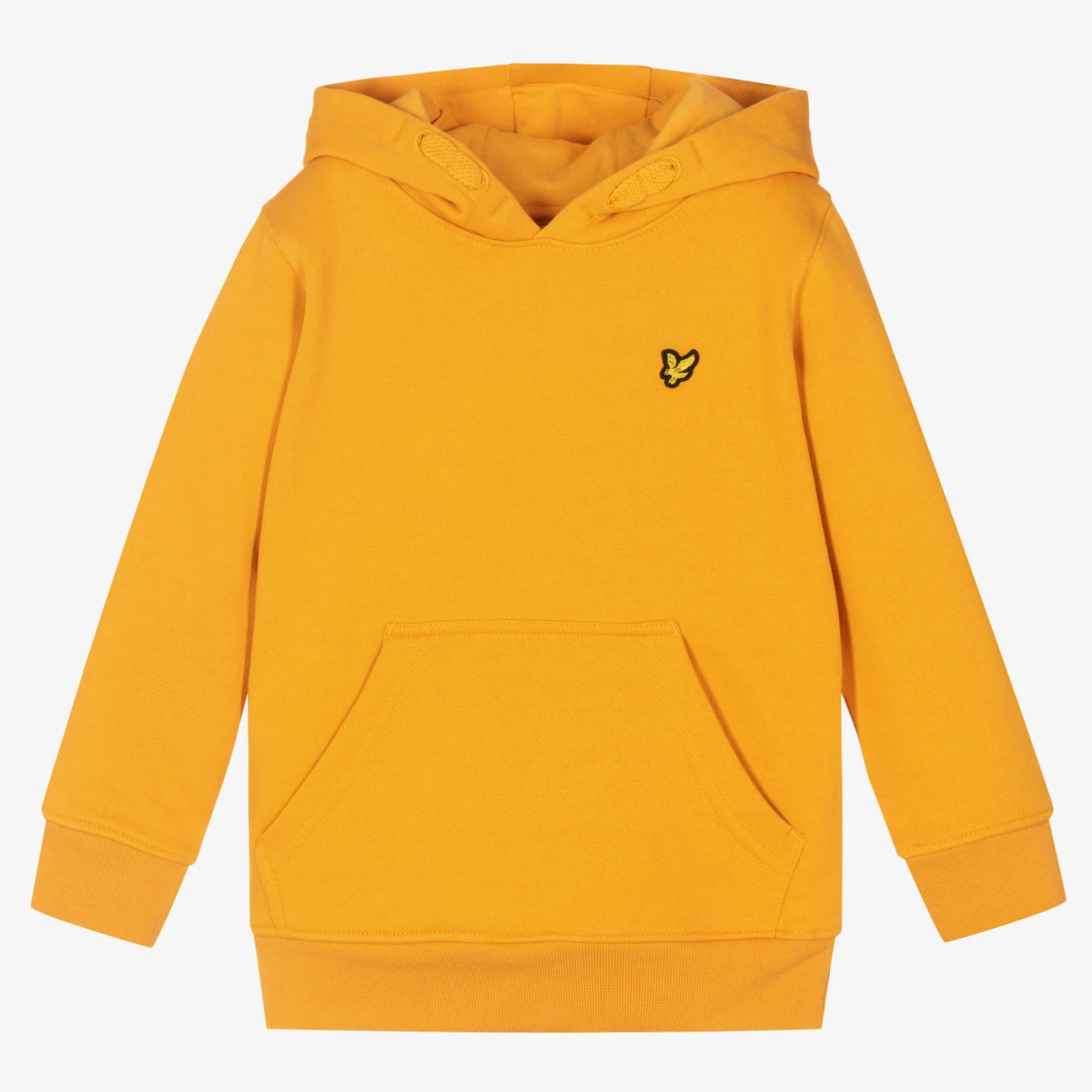 Mustard yellow hooded sweatshirt for boys by Lyle & Scott, with the designer’s iconic golden eagle logo on the chest. Made in soft cotton sweatshirt jersey, it has a faux drawstring detail on the hood and a front pouch pocket.