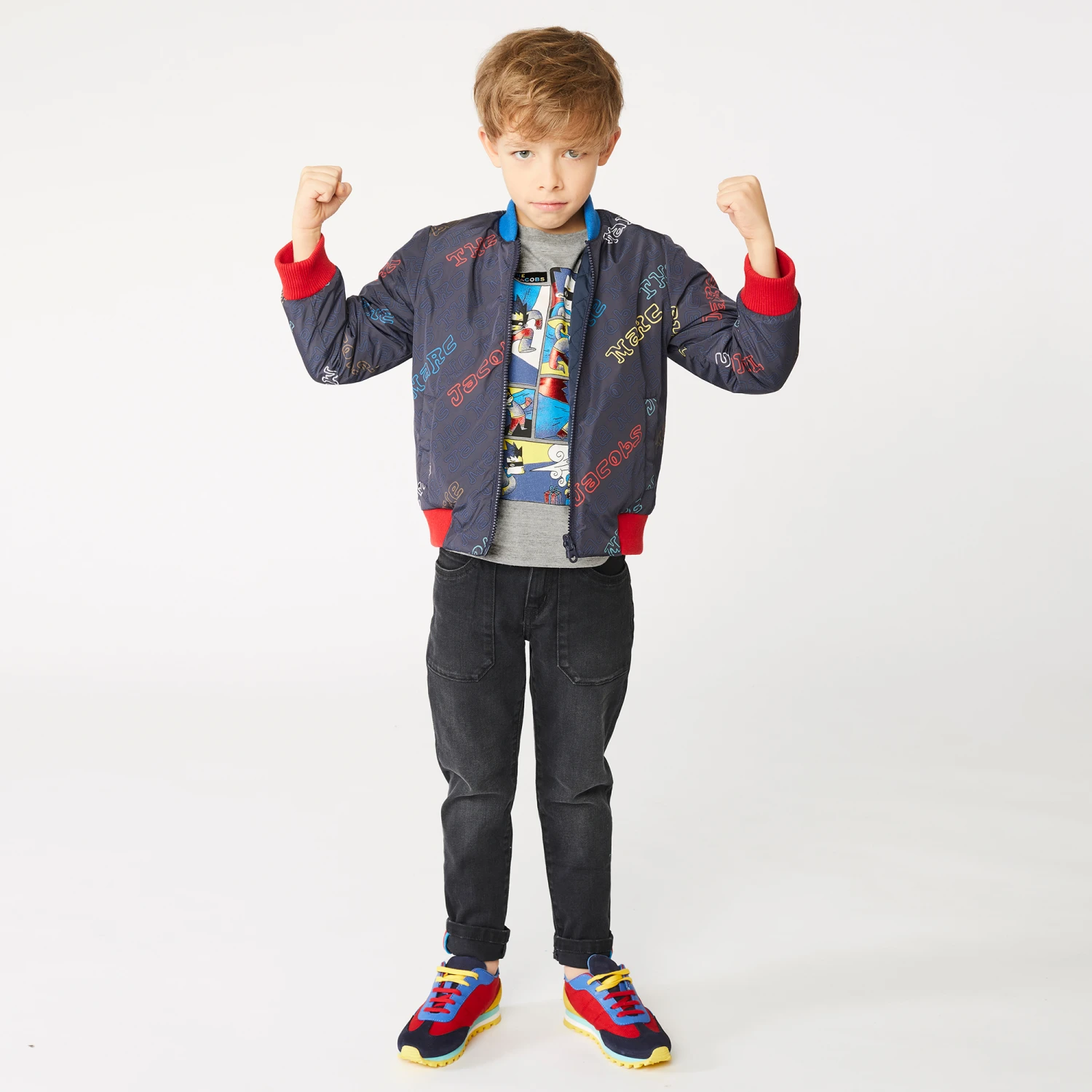 Boys grey marl organic cotton T-shirt by THE MARC JACOBS. Super soft and comfortable, it has a colourful superhero themed comic strip print on the front.