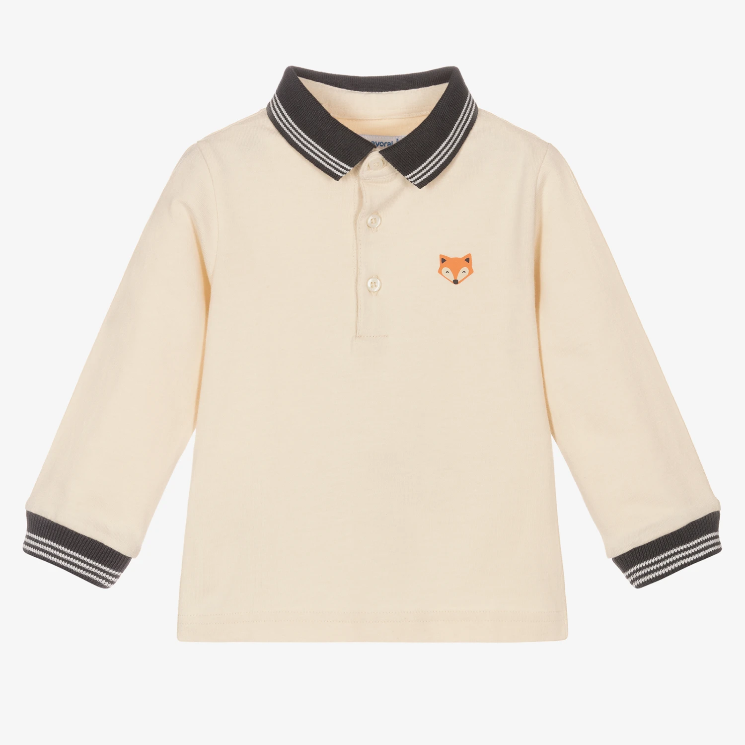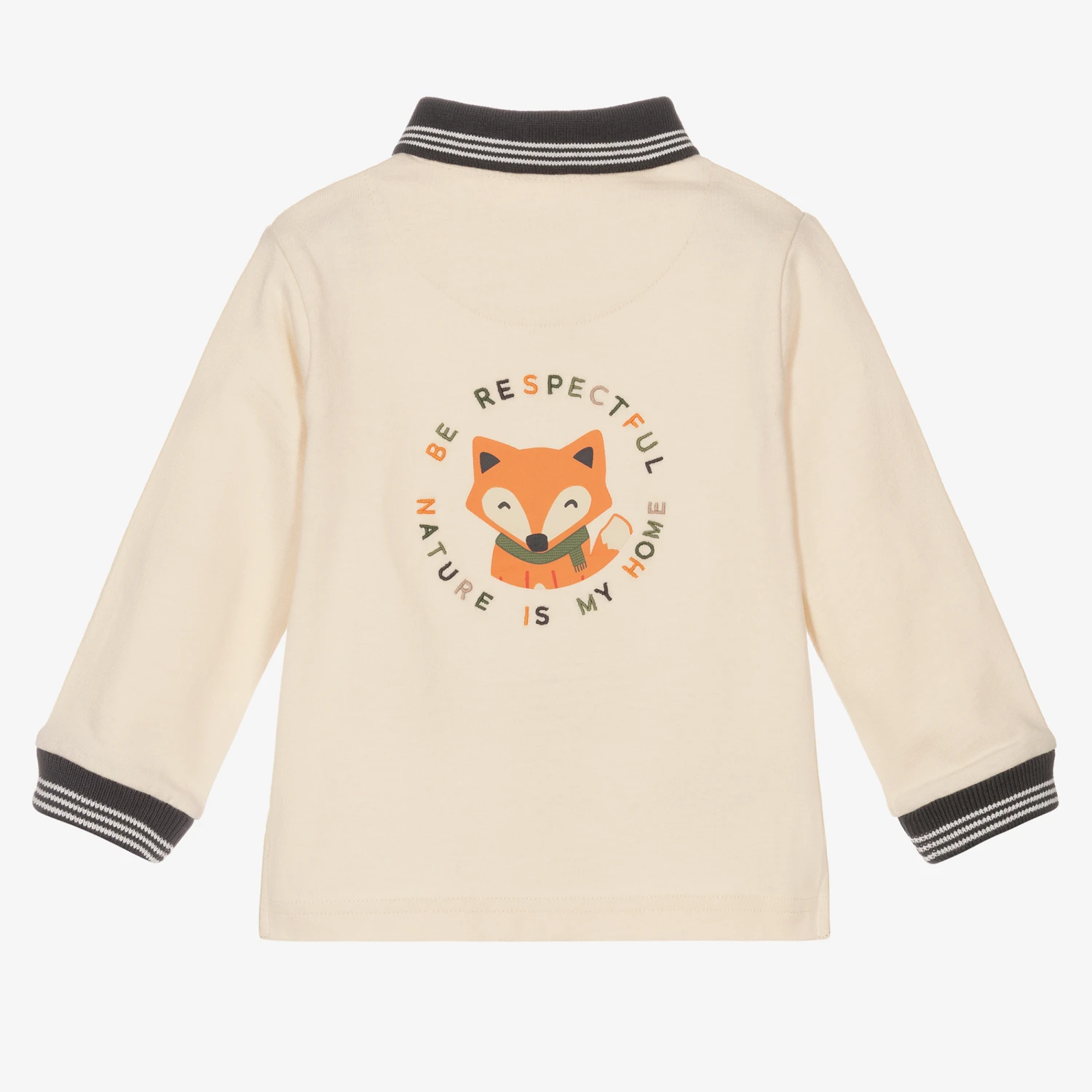 Little boys beige sustainable cotton polo shirt from Mayoral. Made in stretchy, mid-weight jersey, this long-sleeved top has front button fastenings and a stripy grey ribbed collar and cuffs. There are cute little fox prints on the front and back, accompanied by ‘be respectful’ and ‘nature is my home’ embroidery on the back.