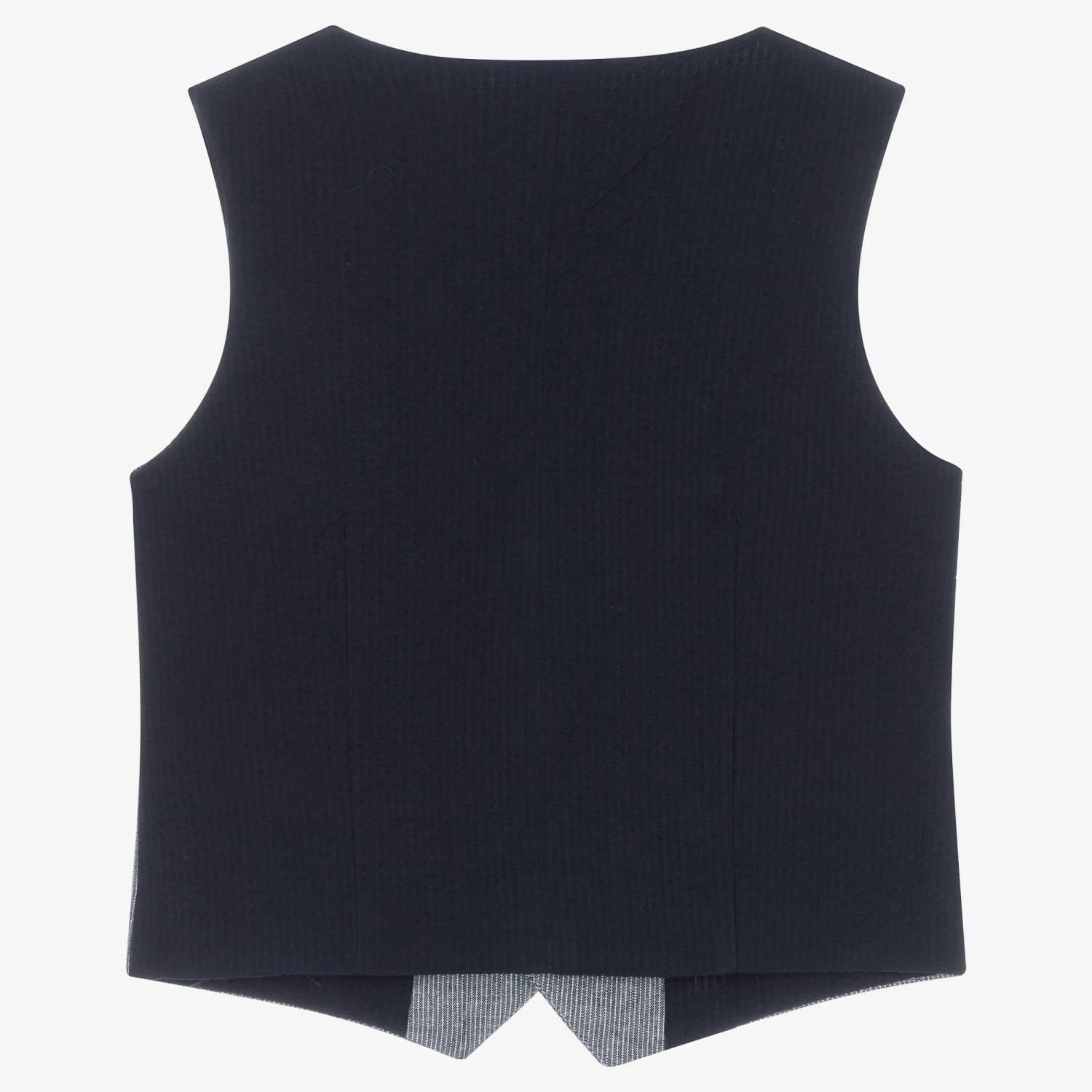 Finely striped blue waistcoat for boys by Mayoral, woven in a soft cotton and linen blend. Lightweight and comfortable to wear, this smartly tailored piece has a lightweight cotton seersucker back, with a matching lining. The front has mock horn button fastenings and welt pockets, adding a stylish finishing touch.