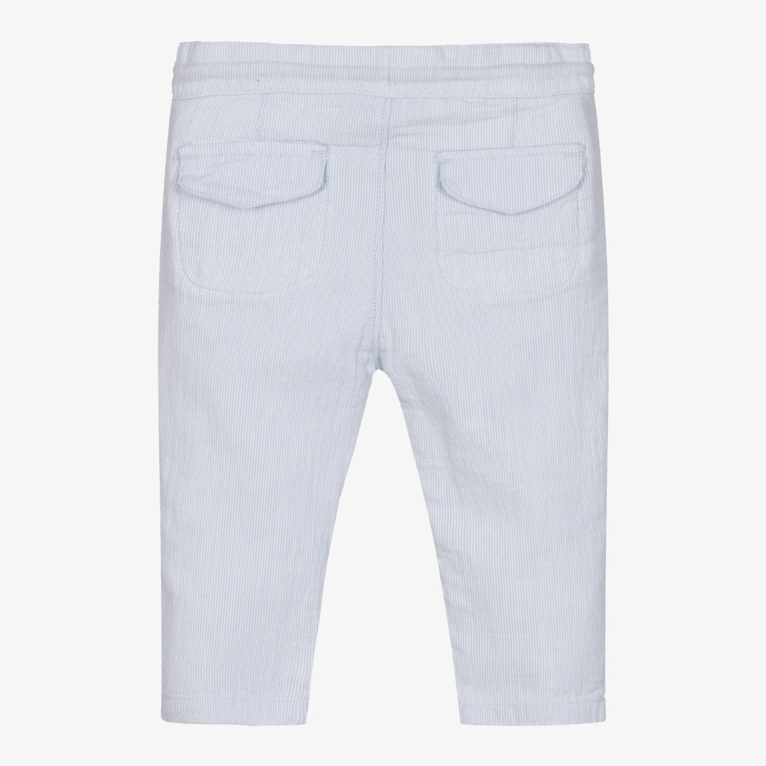 In a pale blue pinstripe, these soft cotton trousers for little boys are by Mayoral. In a comfortable relaxed fit, they have an adjustable waistband with drawstring ties. There are four pockets and a branded button fastening on the front.