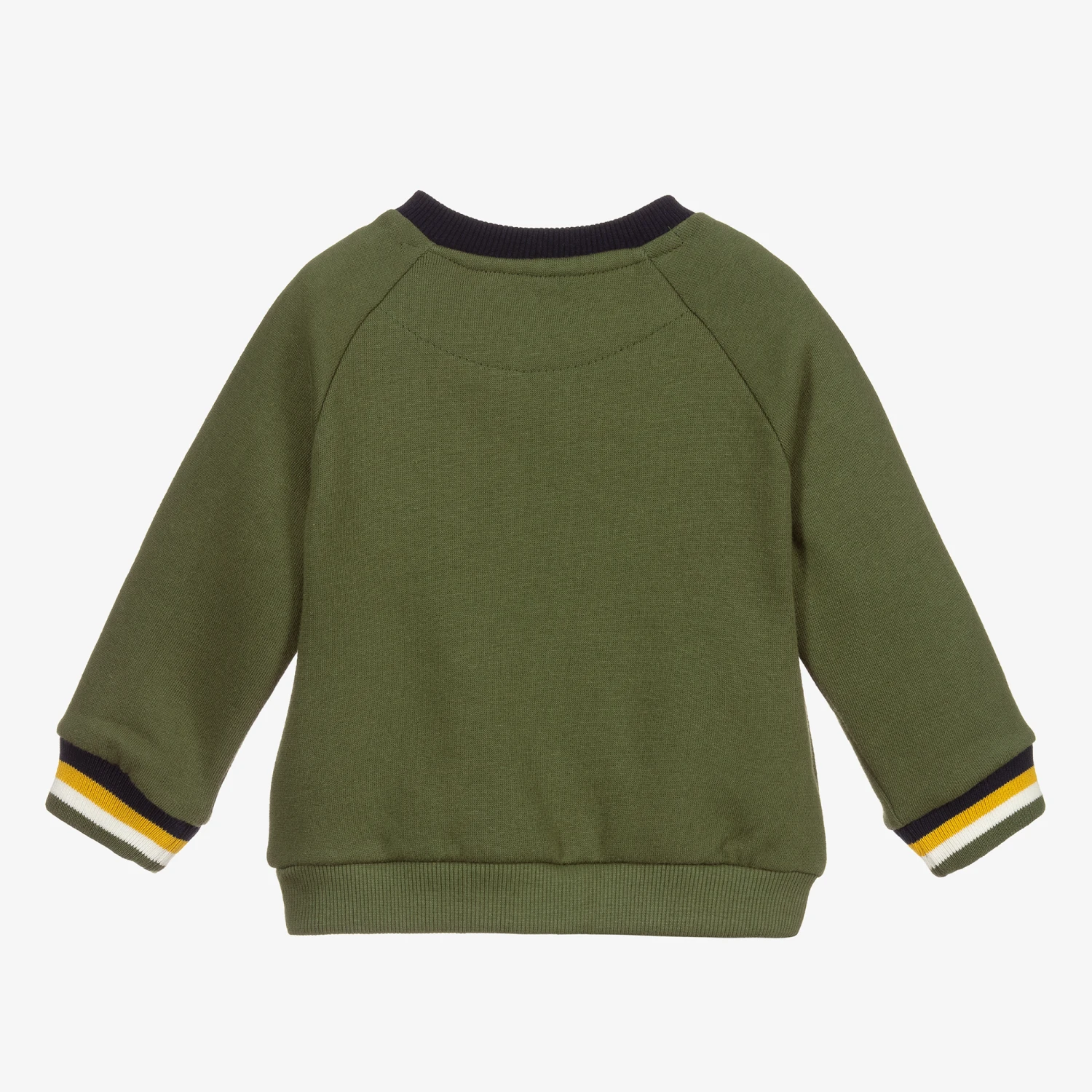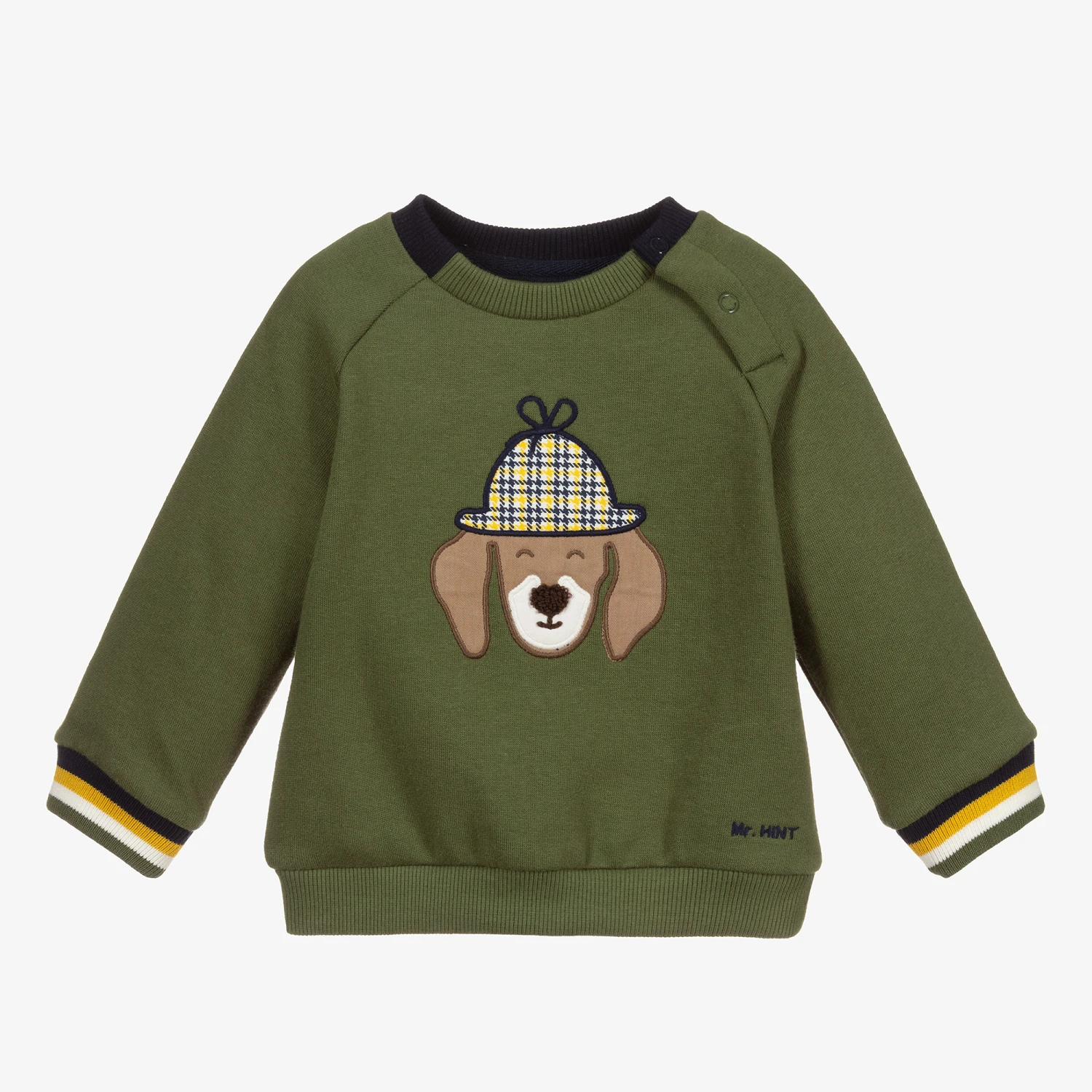 Younger boys green sweatshirt by Mayoral, made in comfortable cotton jersey with a soft fleecy inside. It has a fun dog appliqué in brown, blue and yellow, with ‘Mr. Hint’ embroidered near the hem. There are popper fastenings on the raglan shoulder seam.