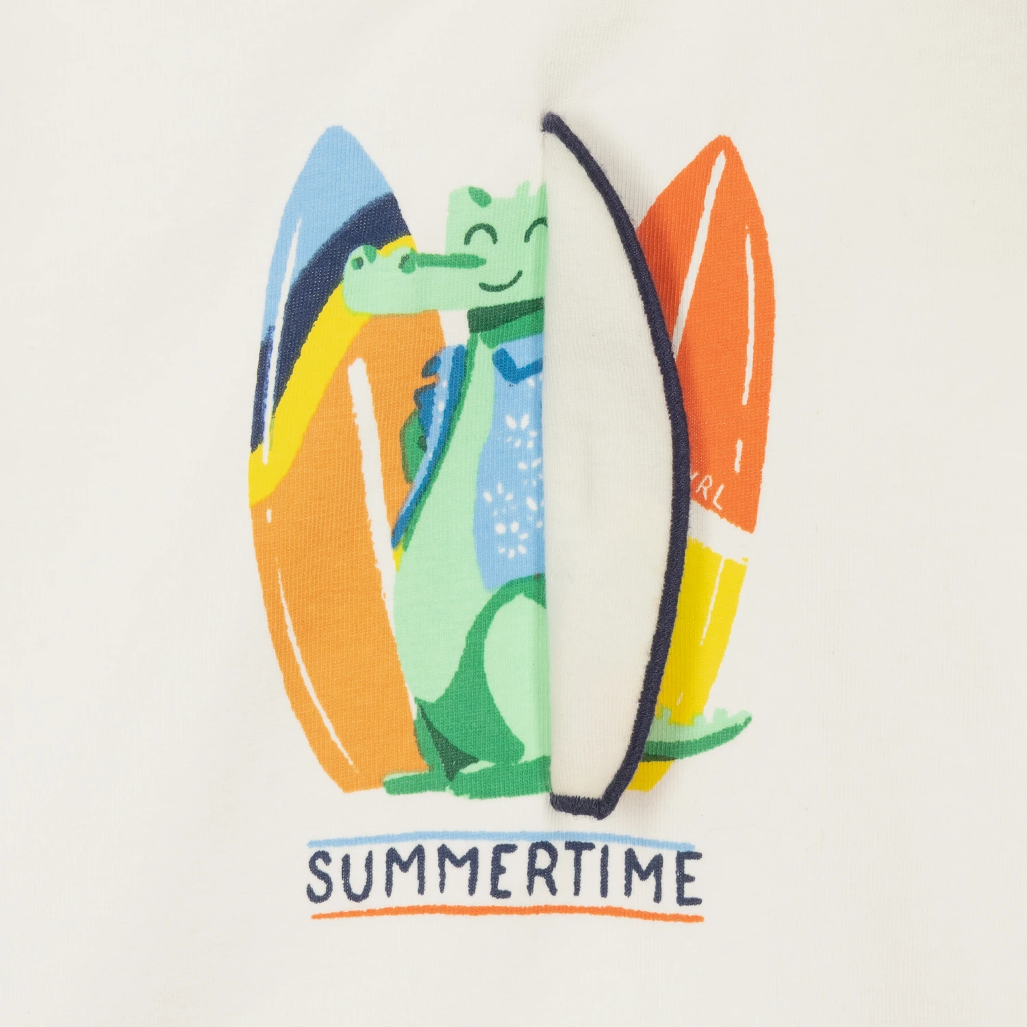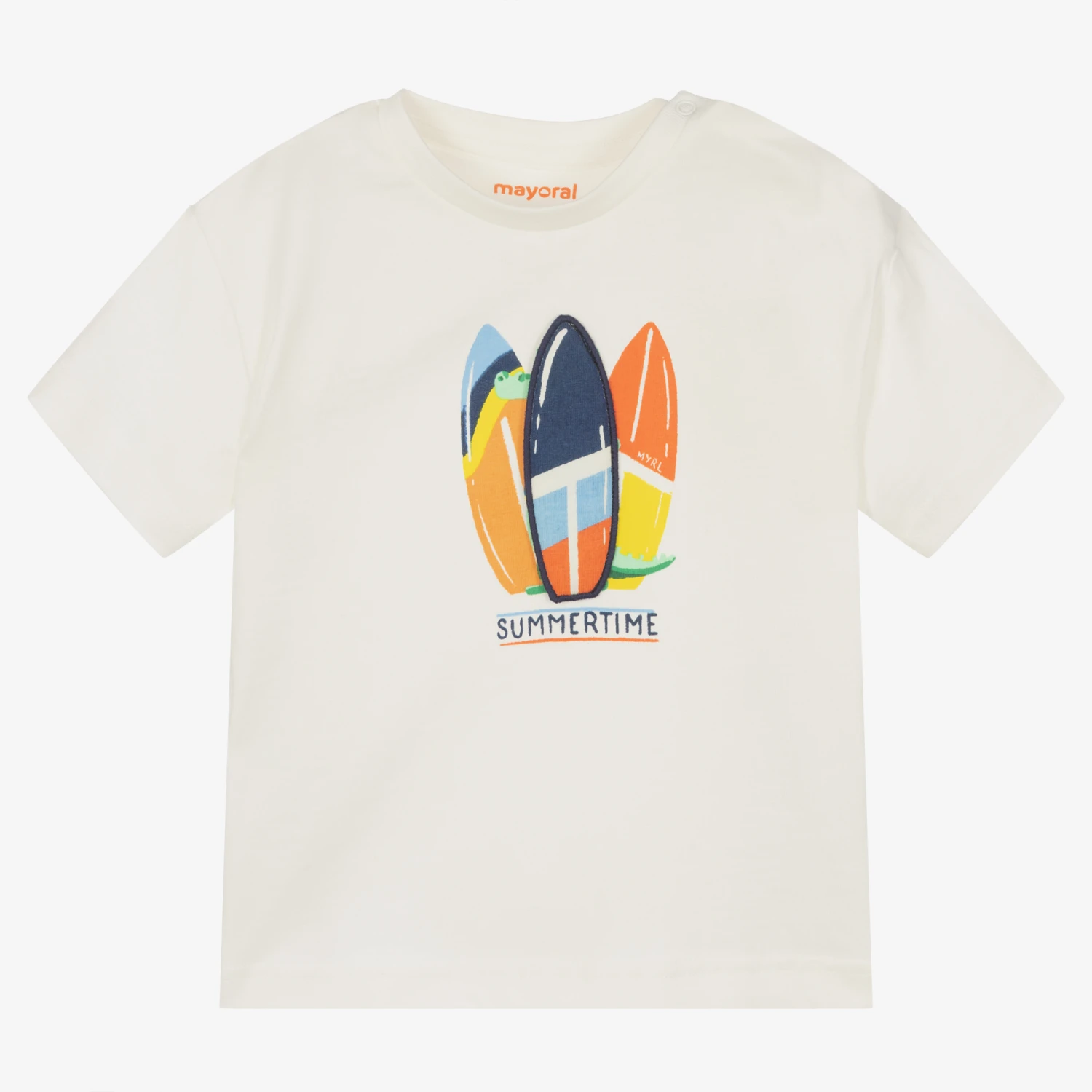 Casual ivory T-shirt for little boys by Spanish brand Mayoral, made in super soft sustainable cotton jersey. It has a cool surfboard and a ‘summertime’ slogan printed on the front, with a surfboard appliqué which folds over to reveal a crocodile. There are popper fastenings on one shoulder for dressing your child easily.