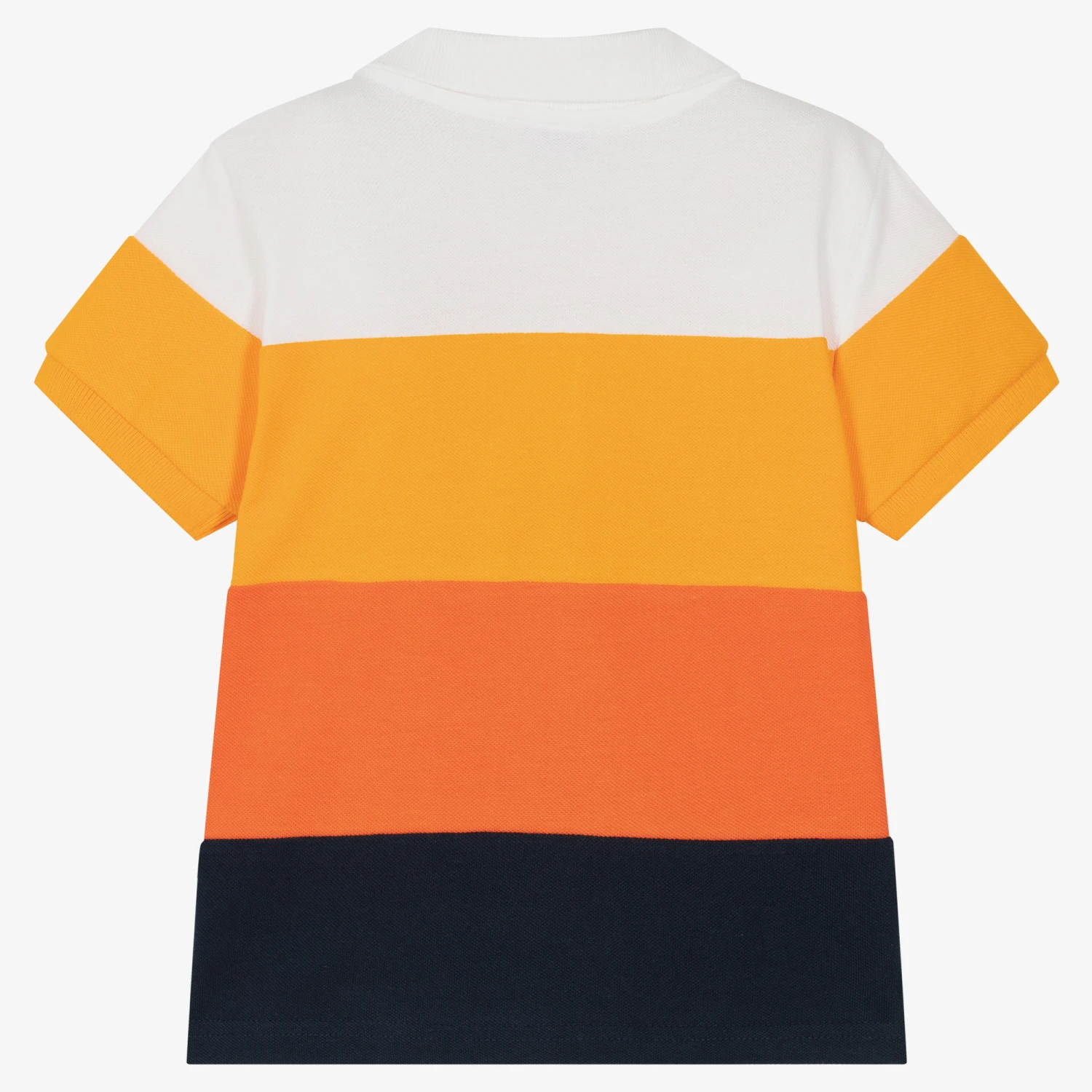 Cotton piqué polo shirt for boys by Spanish brand Mayoral, in wide stripes that graduate from white, orange and to navy blue. Soft and comfortable to wear, it has ribbed collar, branded button fastenings, and a rubberised logo on the chest.
