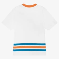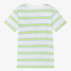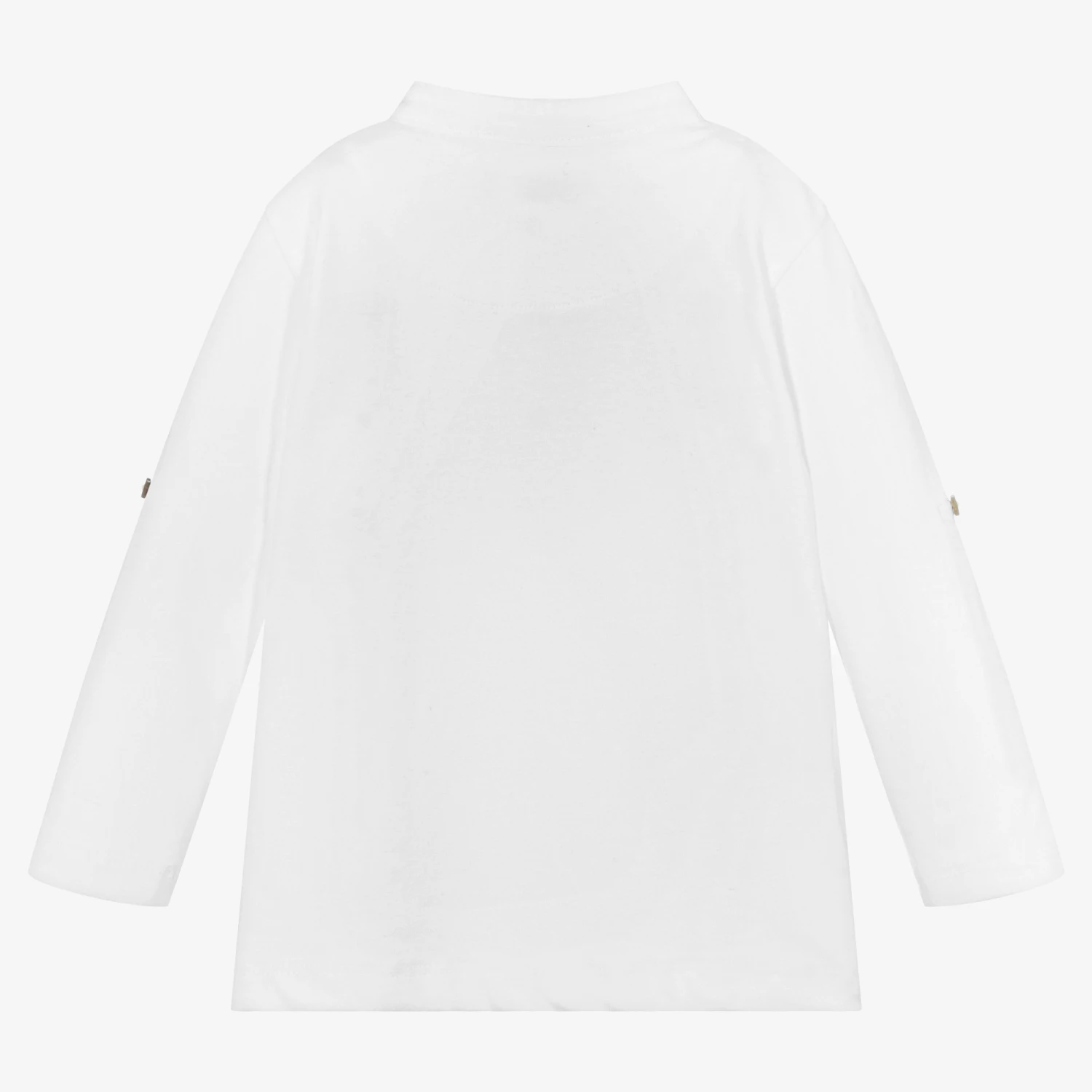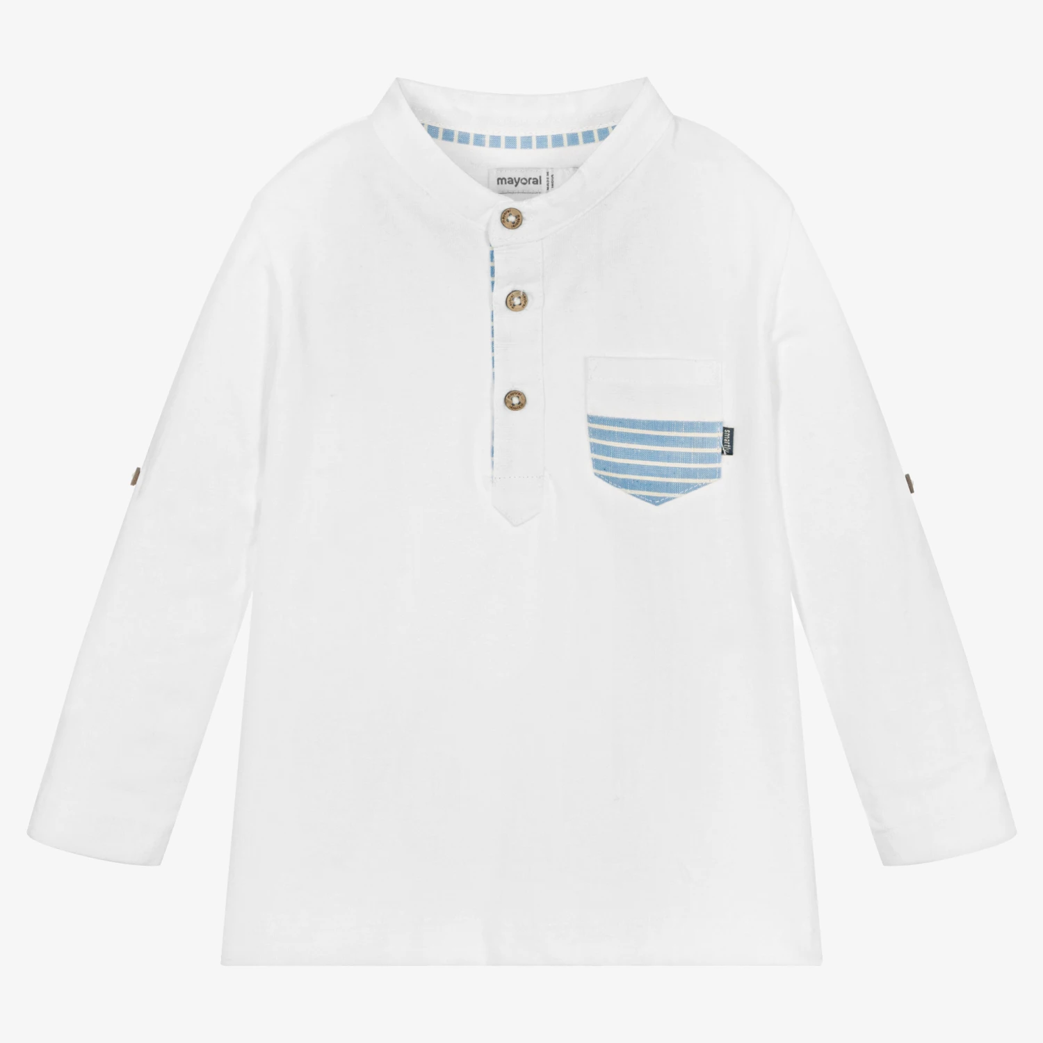 White sustainable cotton Henley top for little boys by Spanish brand Mayoral, made in comfortable jersey for relaxed days. It has pale blue striped trims on the chest pocket, placket and tabs on the roll-up sleeves. It fastens with wood-effect buttons on the front.