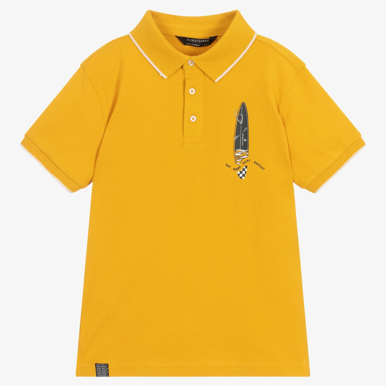 Mustard yellow polo shirt for older boys by Mayoral Nukutavake, made from soft cotton piqué. In a classic style, it has a ribbed collar and cuffs with contrast ivory trims. There is a cool surfboard graphic print on the chest which matches the larger motif and the ‘Eat, Sleep, Surf, Sepeat’ slogan on the back.