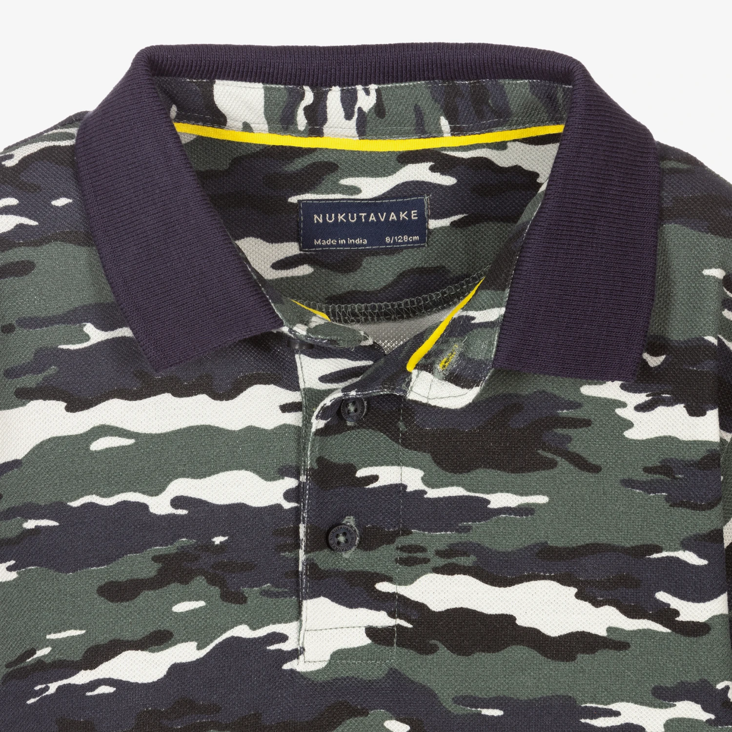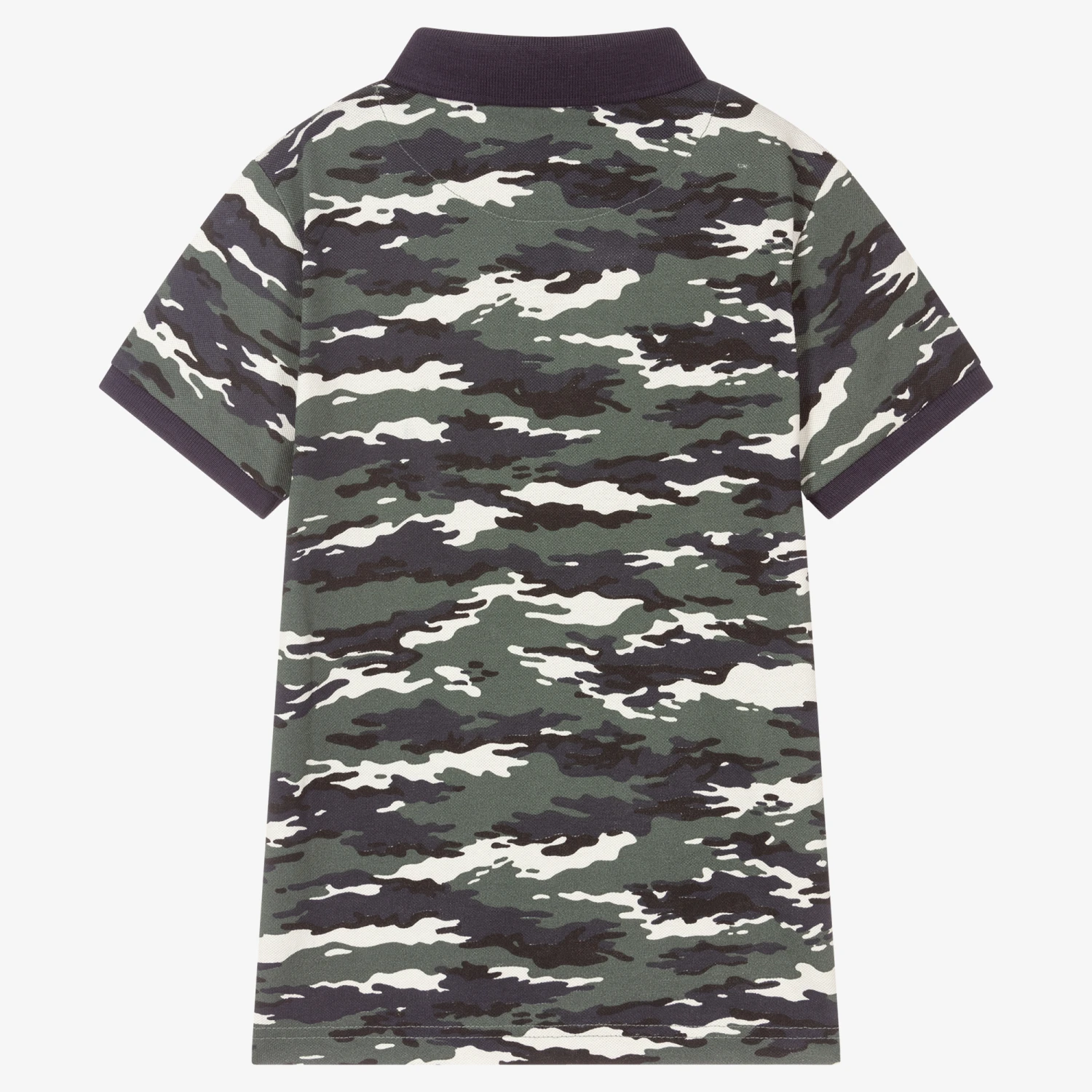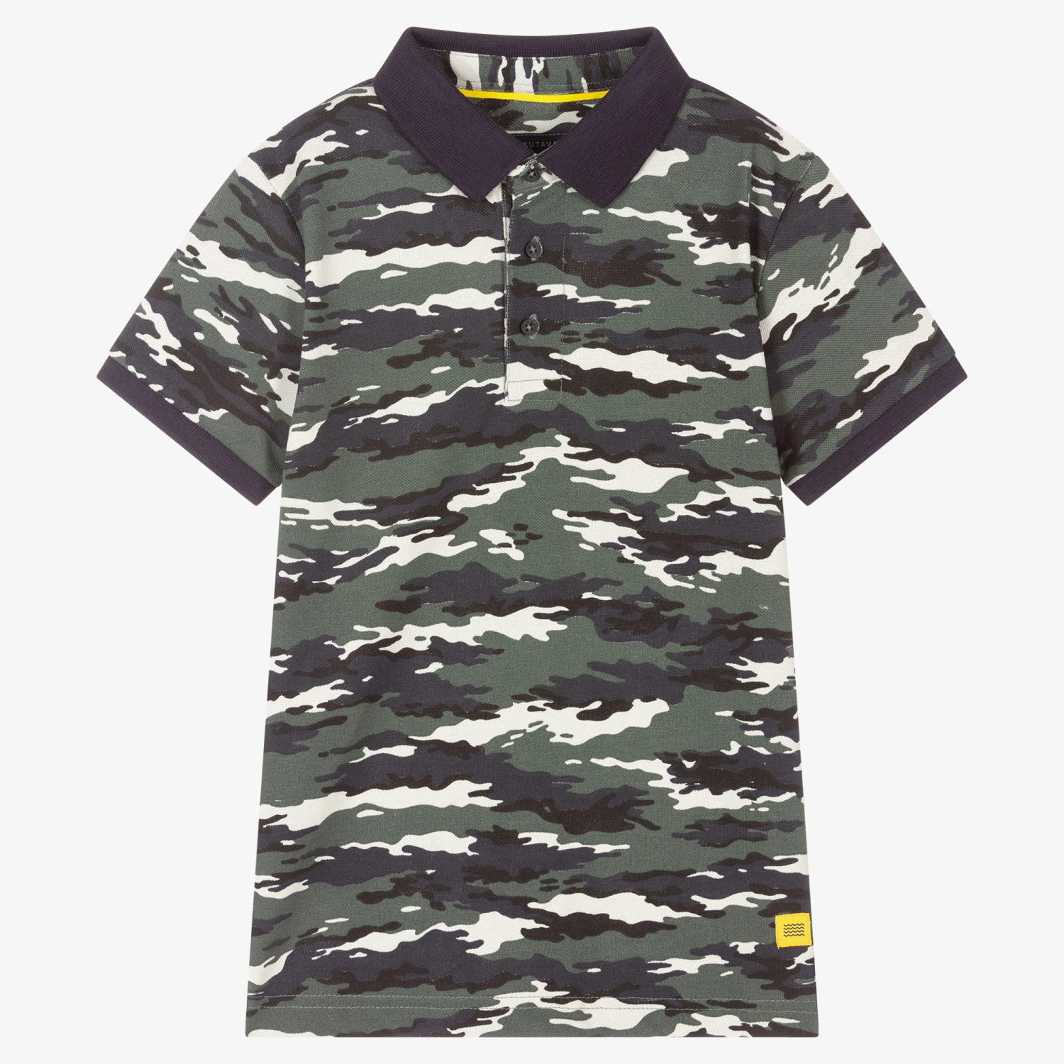 Khaki green, navy blue and white camouflage print polo shirt for boys by Mayoral Nukutavake, made in lightweight cotton piqué. It has navy blue ribbed trims, logo buttons on the front and a yellow logo tab by the hemline.