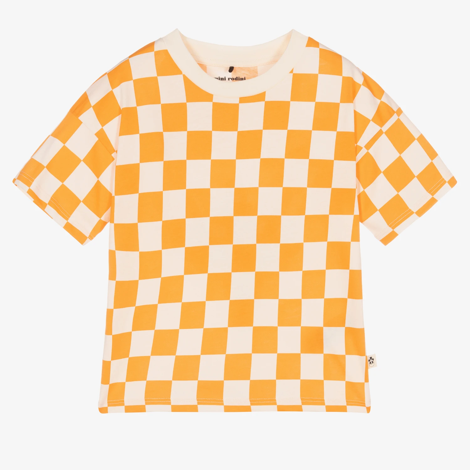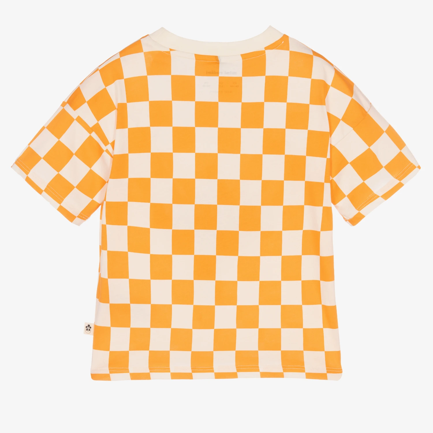 Orange and ivory checked T-shirt for boys and girls by Mini Rodini. Made in soft organic cotton jersey, it has a relaxed fit and the brand’s signature Panda tab on the side seam.
