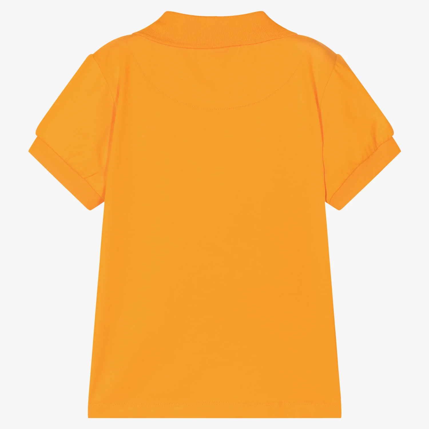 Bright orange polo shirt for little boys by British designer Mitch & Son, made in soft, breathable cotton jersey. This playful top features a contrasting blue insert and a rubberised logo on the chest. It has a ribbed collar and trims, with button fastenings on the front to ensure that dressing is easy.