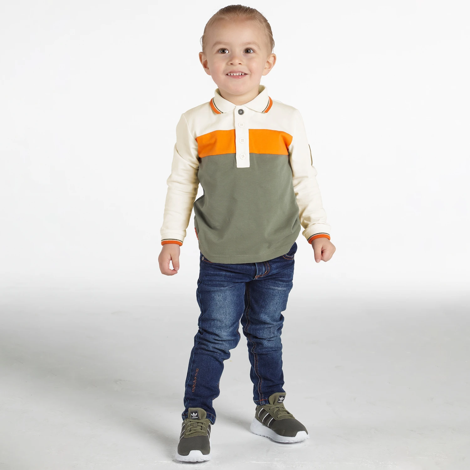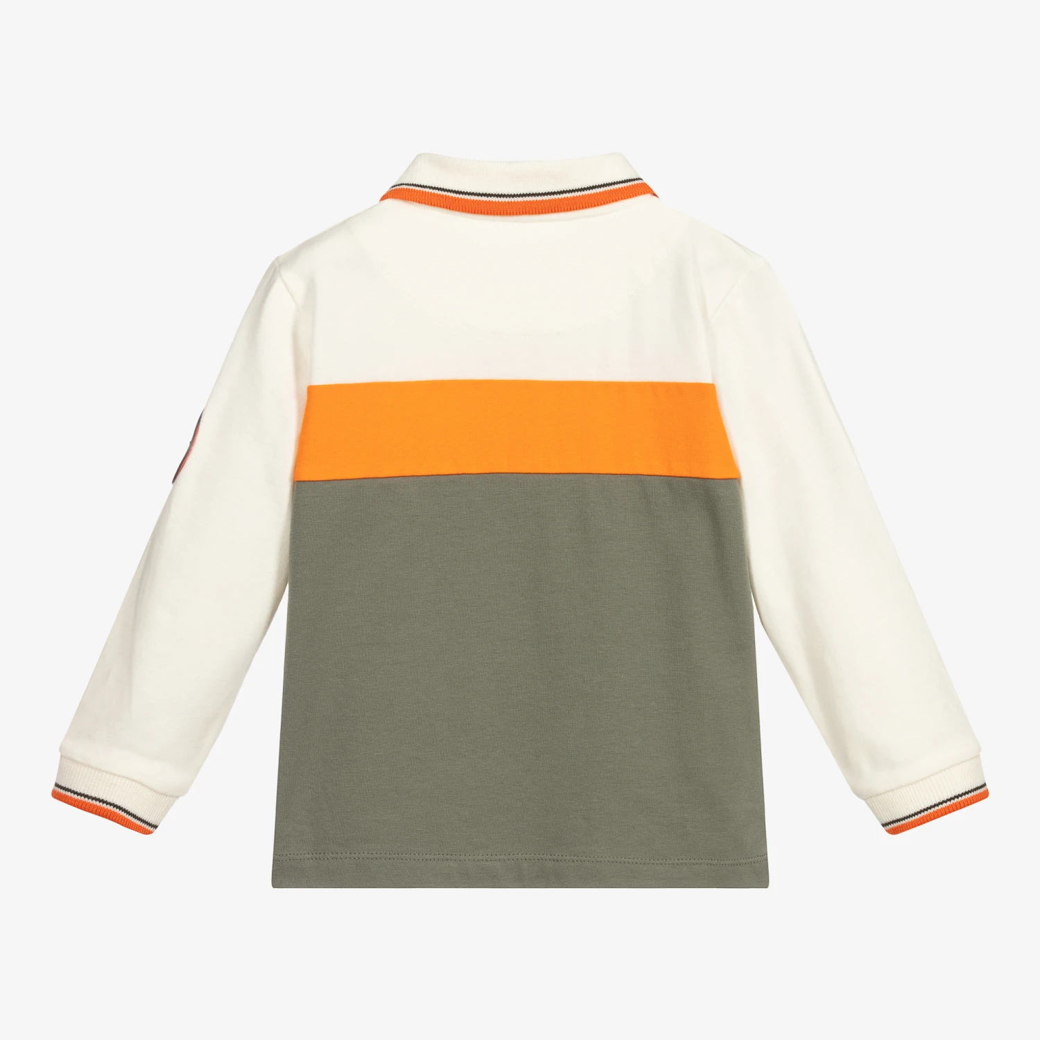 Colourblock polo shirt for boys by Mitch & Son, in green, orange and ivory. It is made in soft cotton jersey, with a ribbed collar and cuffs. There is an orange rubberised logo at the hem.