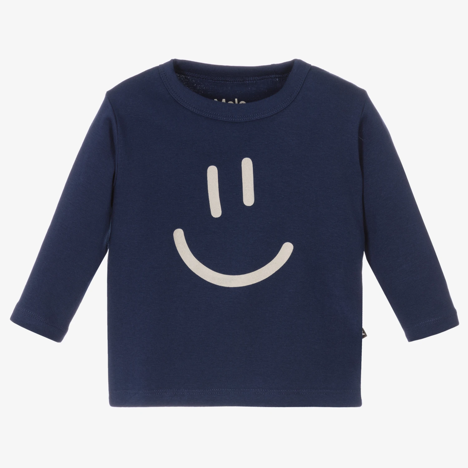 Little boys and girls deep blue top by Danish brand Molo, made in soft organic cotton jersey. A fun and playful top, it has a navy blue smiley face print on the front.