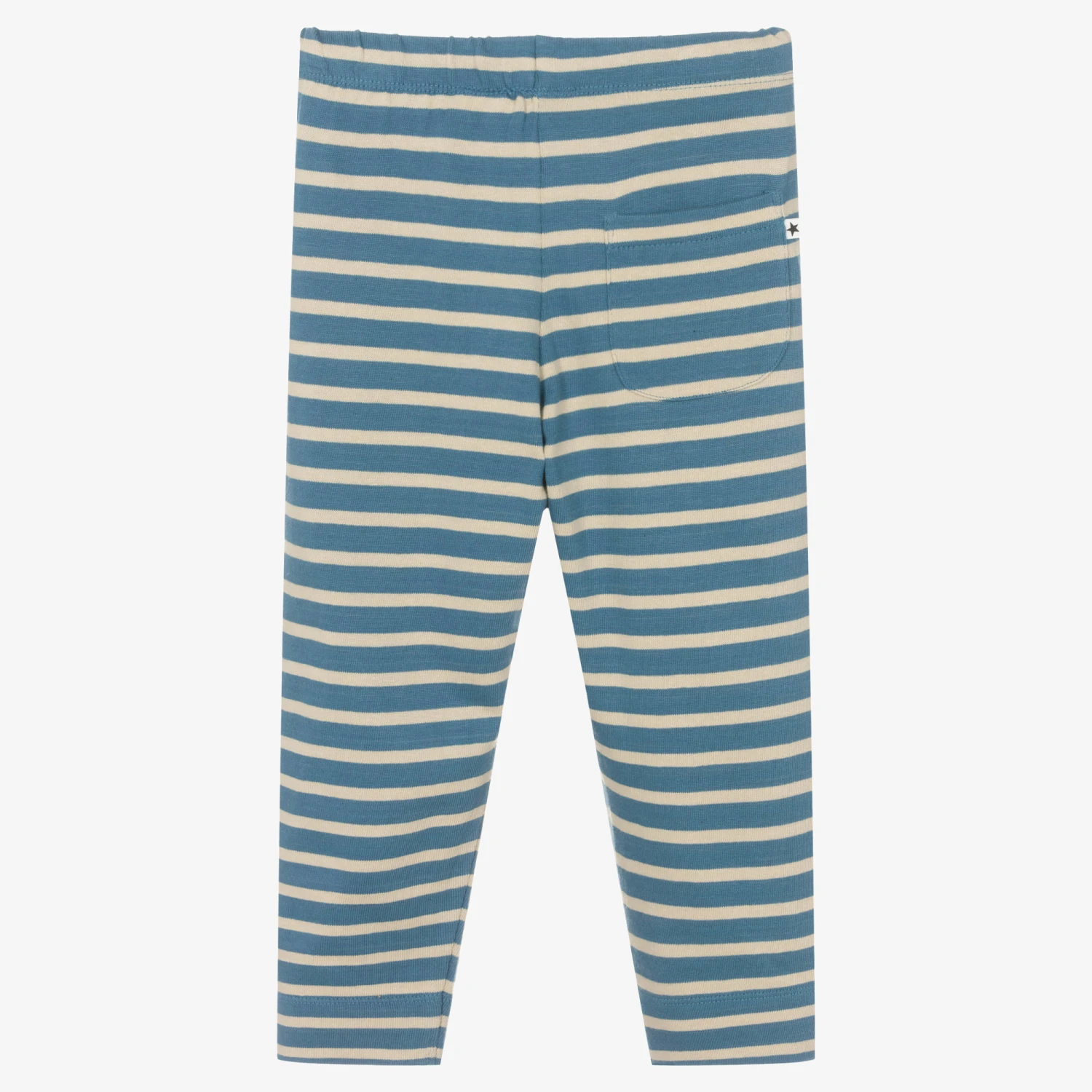 Beige and ivory organic cotton trousers for little boys and girls by Danish brand Molo. Made in a light knit for all-day comfort, they have a smiley face embroidered on the front in pastel green and a matching green drawstring on the waist. They have a useful pocket on the back, featuring the brand’s star logo tab for a logo-inspired finish.