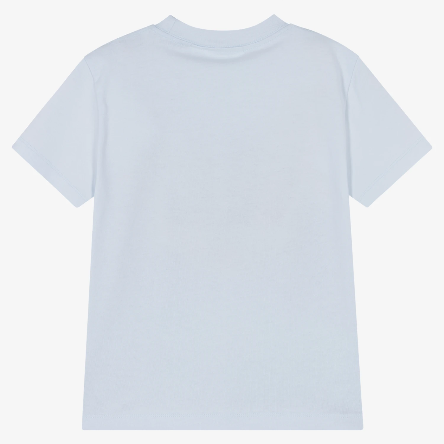 Boys pale blue T-shirt by Molo, patterned with a hyper-detailed dinosaur print. It is made in soft organic cotton jersey and has a casual crew neckline.