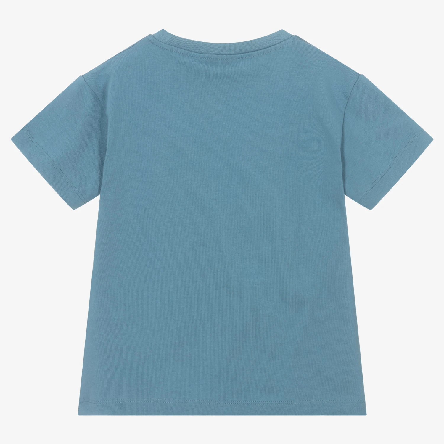 Boys blue T-shirt by Molo, patterned with a vibrant mountain leopard print on the front. Made in soft organic cotton jersey, it has a crew neckline and short sleeves for a casual look.