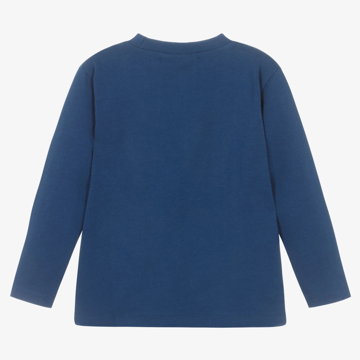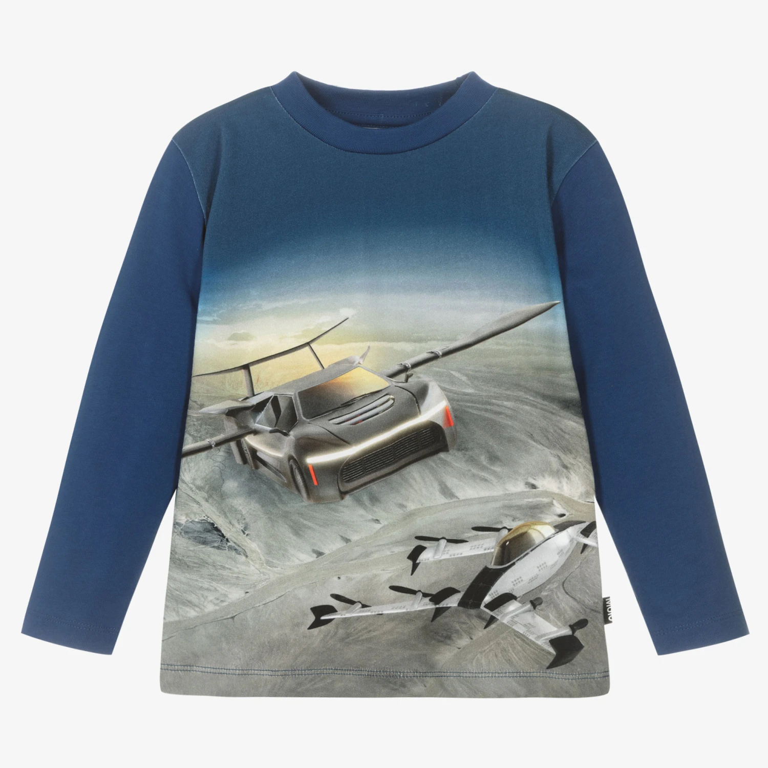 Blue long-sleeved top for boys by Molo, made in soft organic cotton jersey. It has a cool flying cars print on the front, ideal for car lovers.