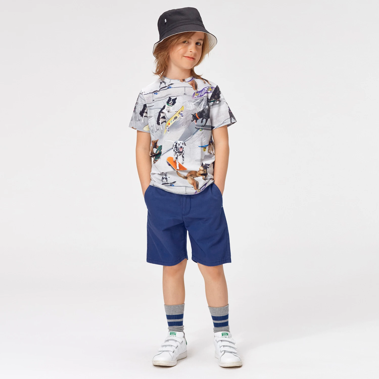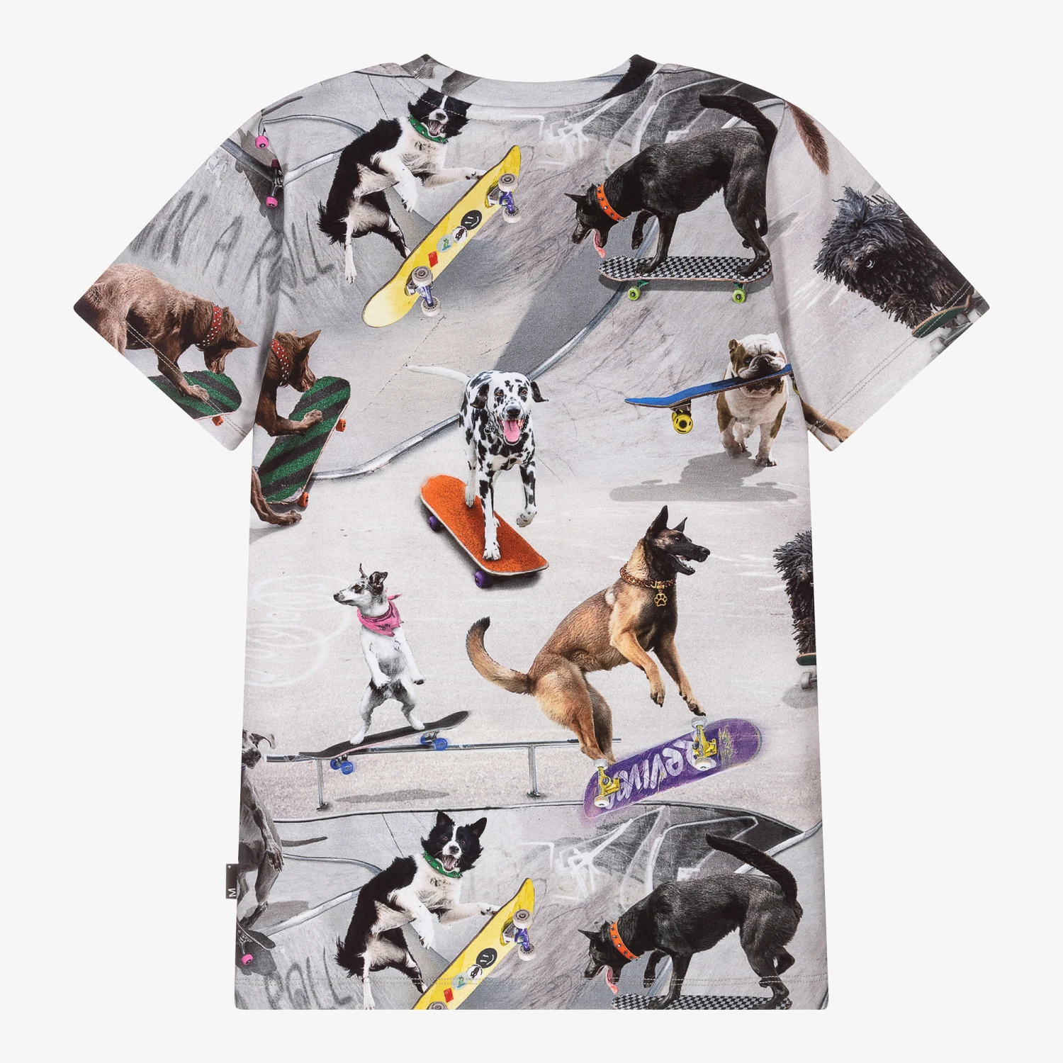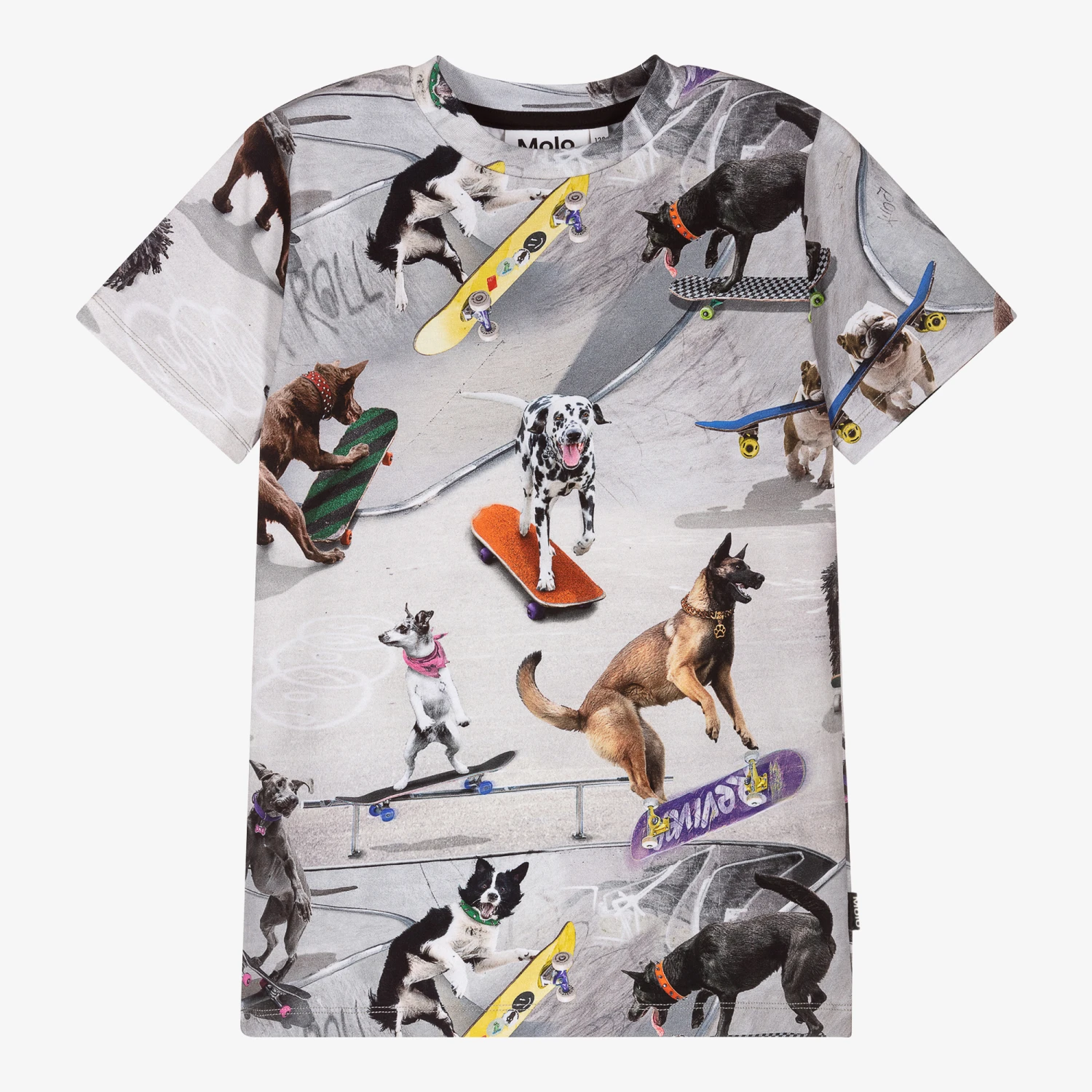 Grey T-shirt for boys, by Molo. Made from soft organic cotton jersey, it has a cute dogs on skateboards print.