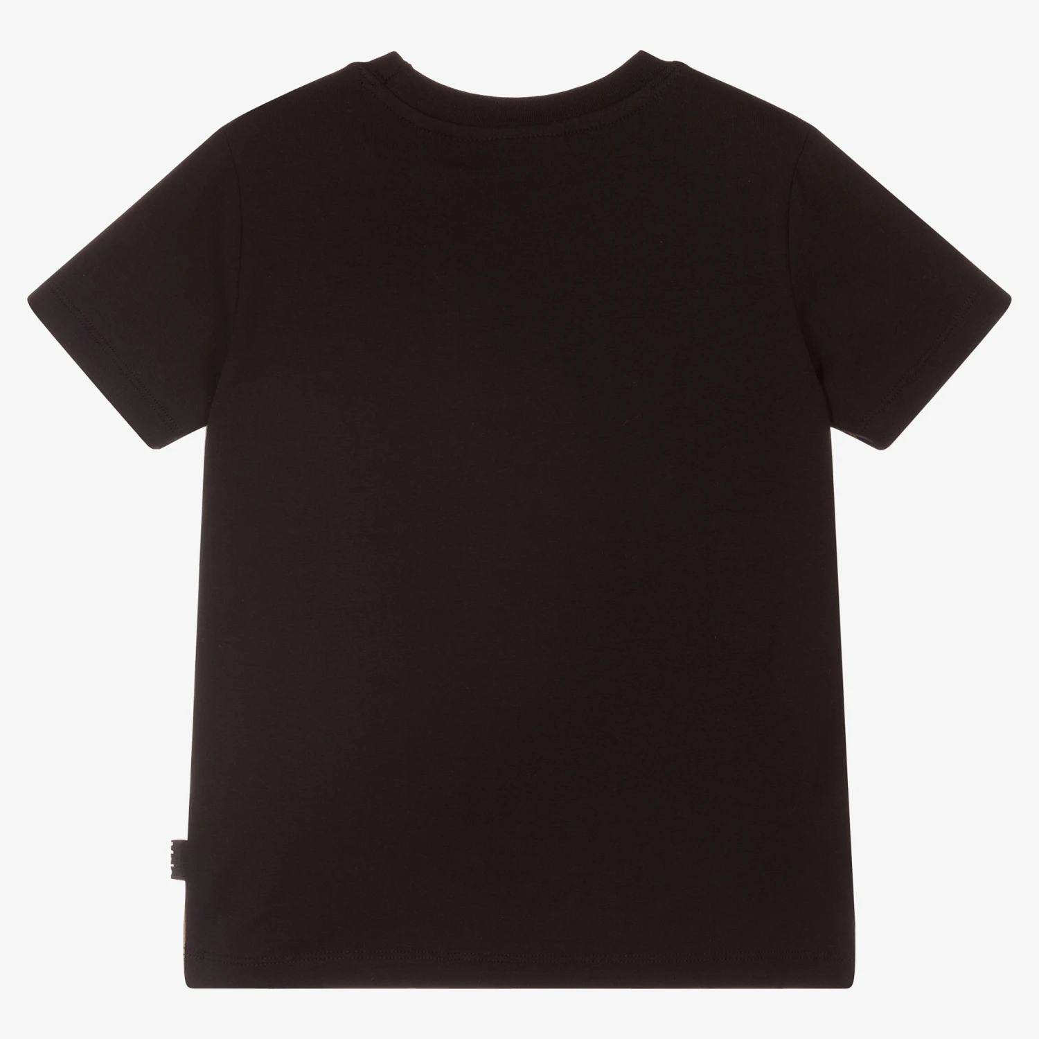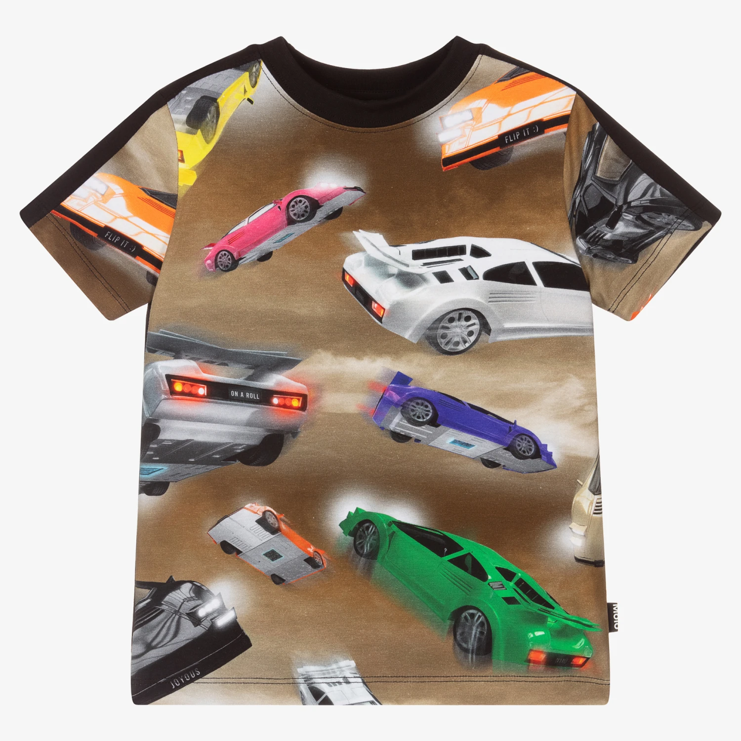 Graphic black T-shirt for boys, by Molo. Made from soft organic cotton jersey, it has a colourful sports car print on the front on a brown background .