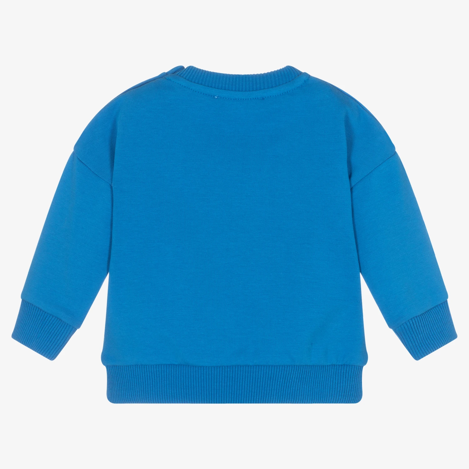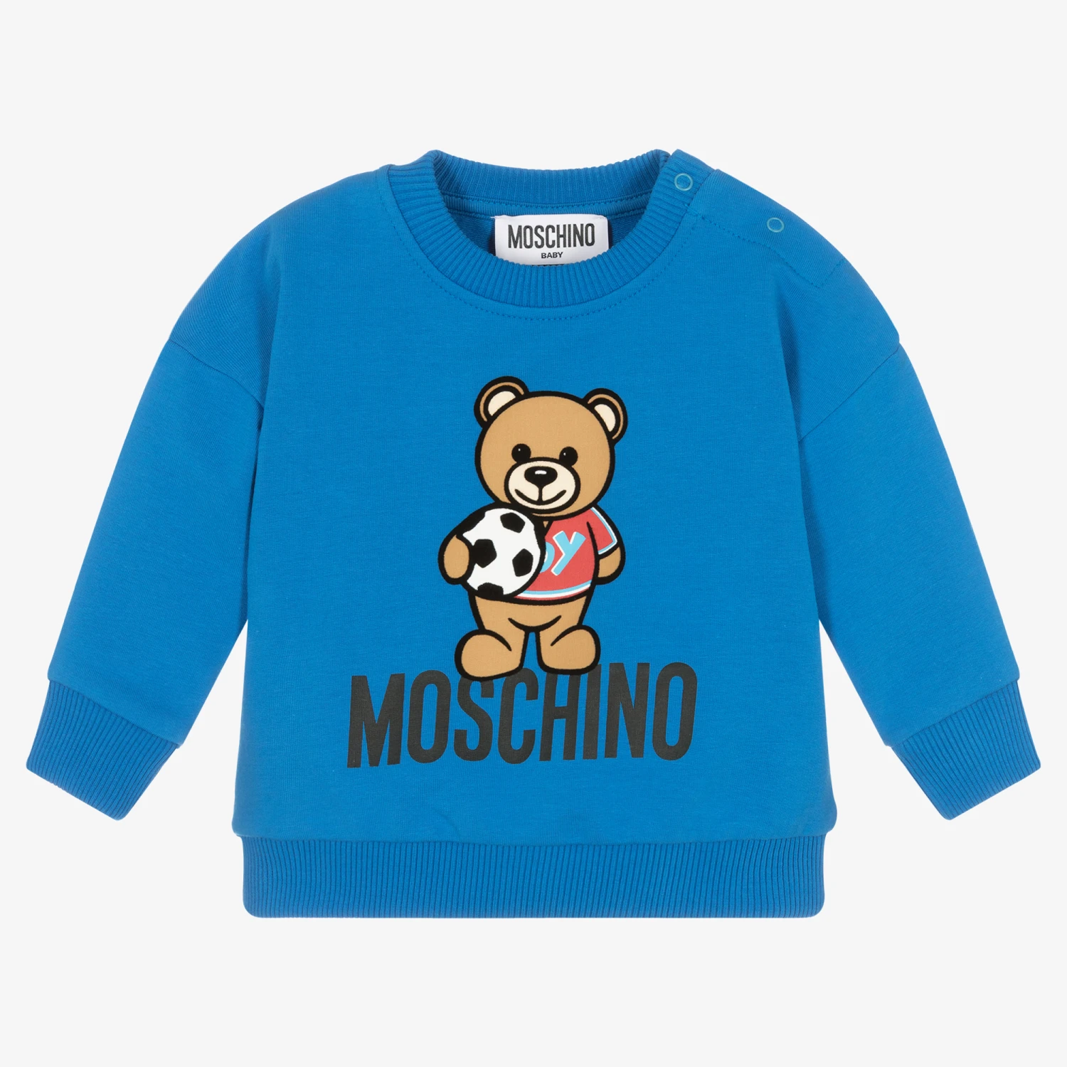 Casual cobalt blue sweatshirt for little boys by Italian designer Moschino Baby, made in luxuriously soft cotton jersey with a looped underside. It has the brand’s signature Teddy Bear logo with a football printed on the front. There are useful popper fastenings on one shoulder.