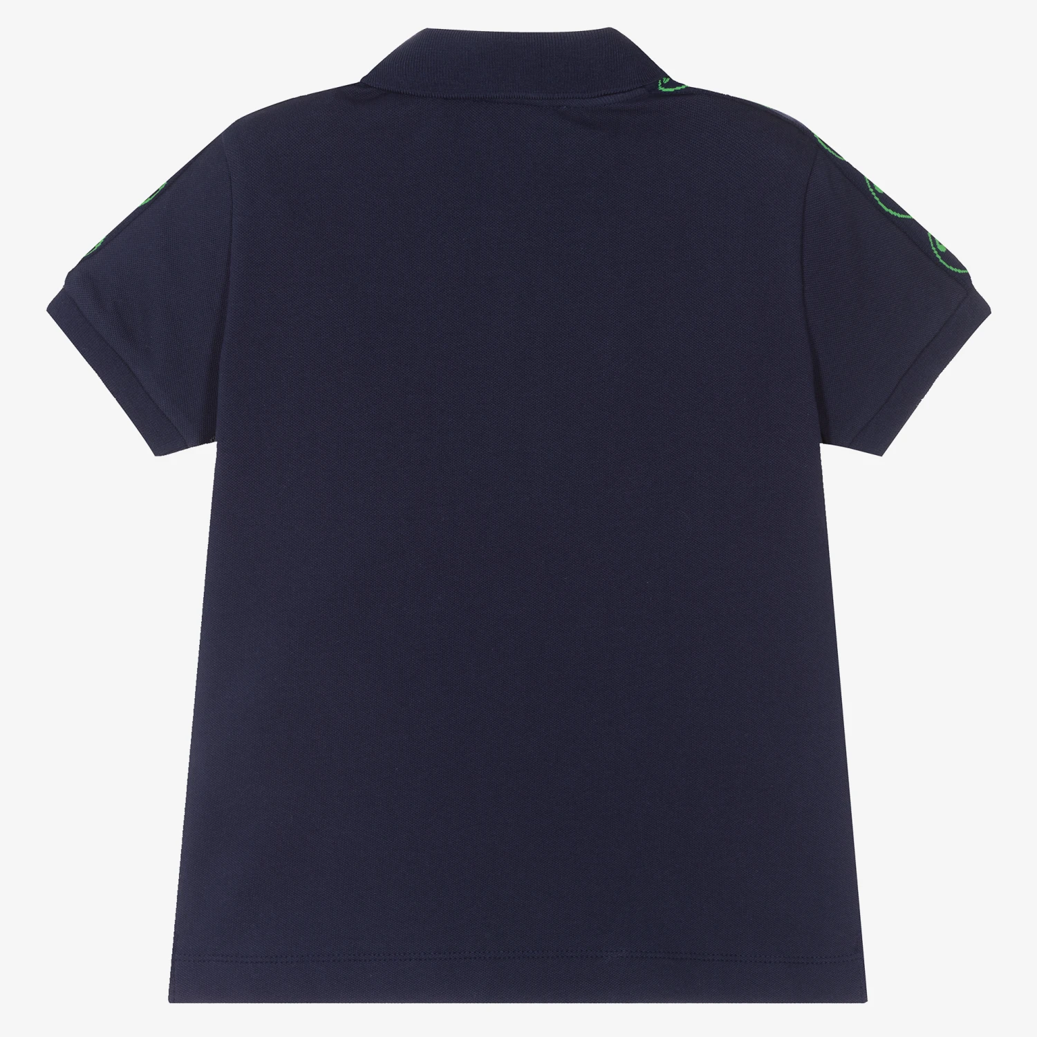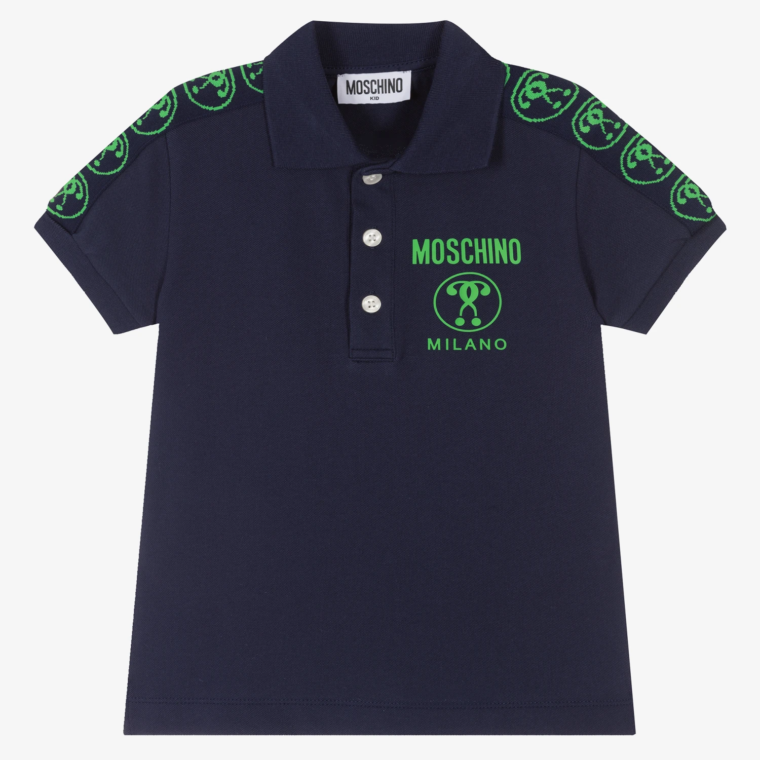Mini-me navy blue polo shirt for boys by Moschino Kid-Teen, made in soft cotton piqué. Inspired by the brand’s timeless and seasonal logos, it has a classic rubberised logo print on the chest in neon green, and Double Question Mark logo taping on the shoulders. Cool and contemporary, the button fastenings on the front placket are branded for an added designer detail to this smart-casual style.