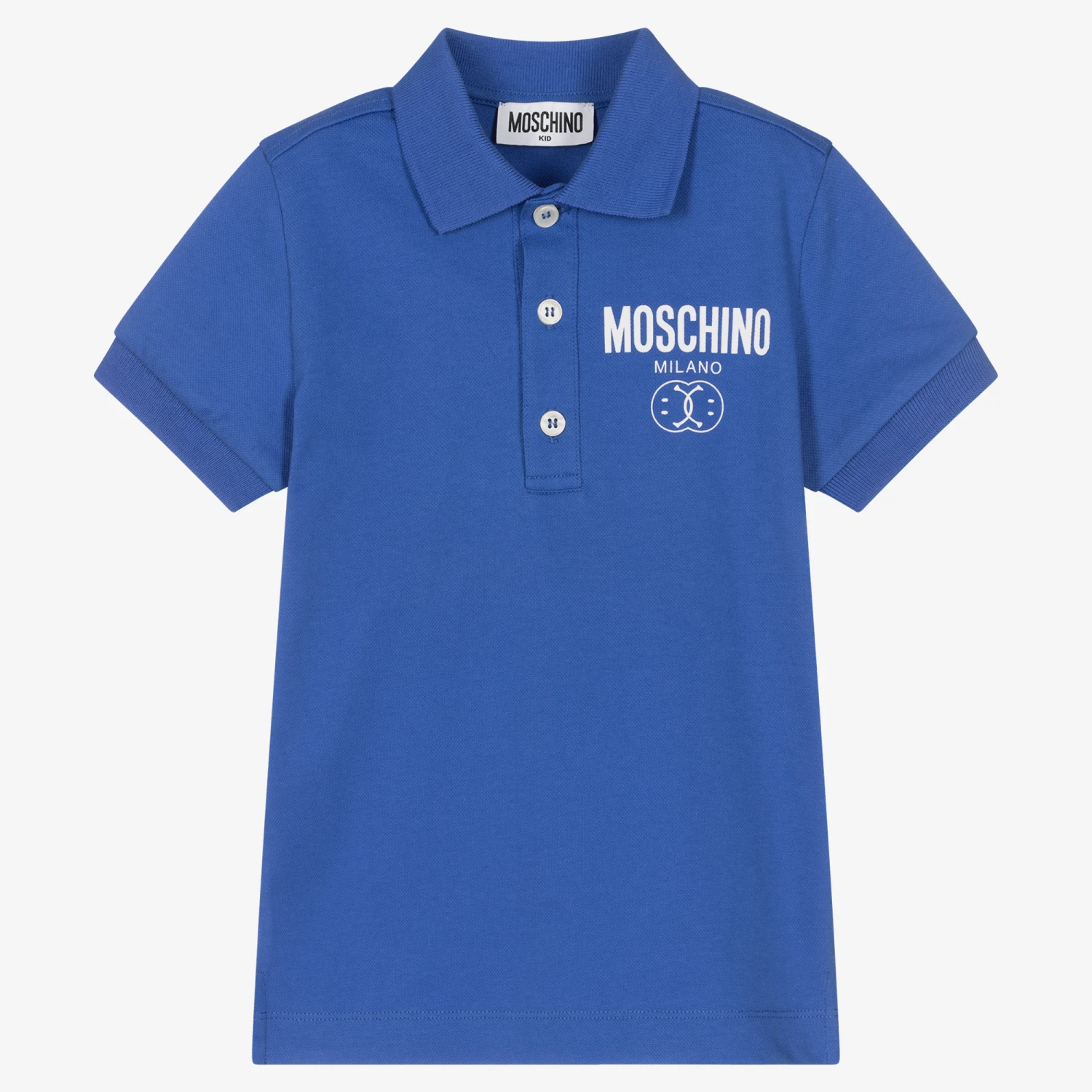 Mini-me blue polo shirt for boys by luxury Italian brand Moschino Baby, with the designer’s Double Smiley logo on the chest in white. Made in soft and comfortable cotton piqué, this classic style has a ribbed collar and front button fastenings.