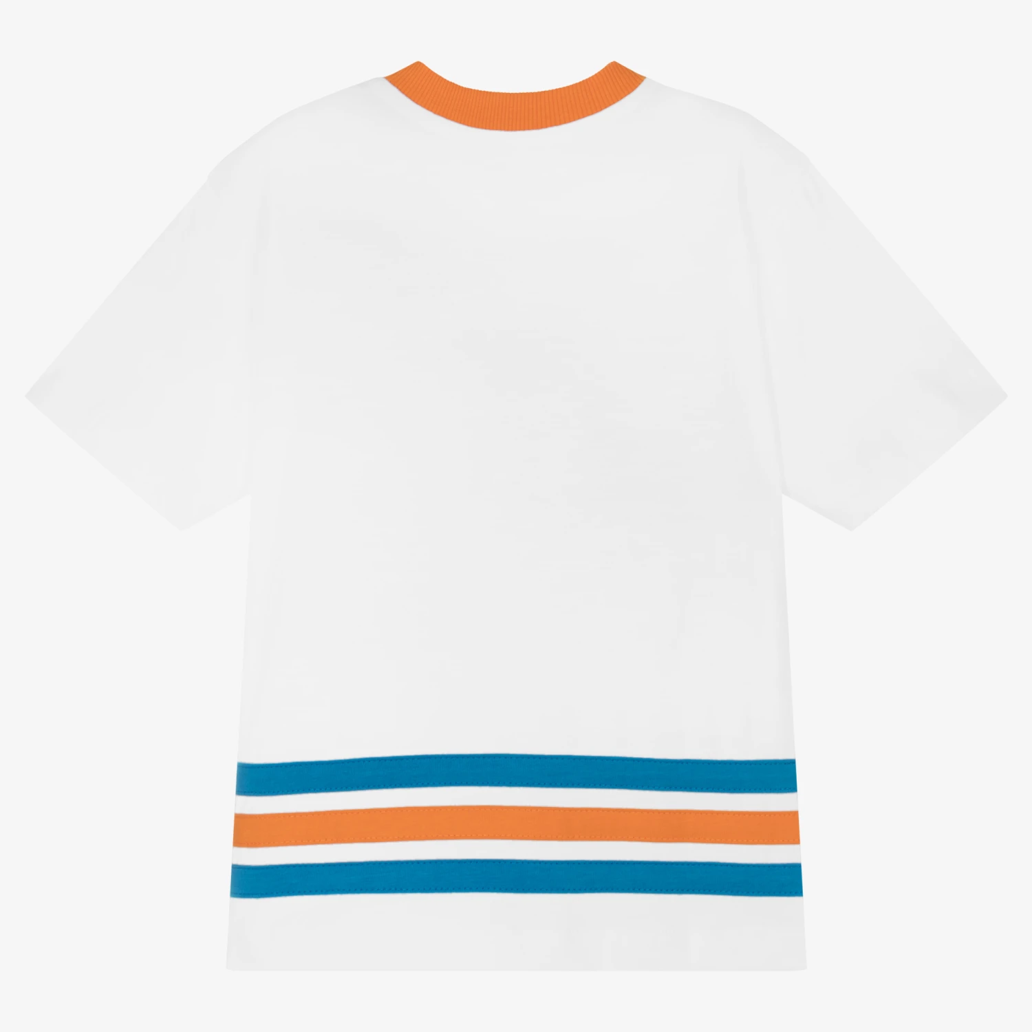 White Mini-Me T-shirt for boys by Moschino Kid-Teen, made in soft and stretchy cotton jersey, with a college style blue logo print on the front. There are orange and blue striped trims on the hem and shoulders and an orange ribbed neckline.