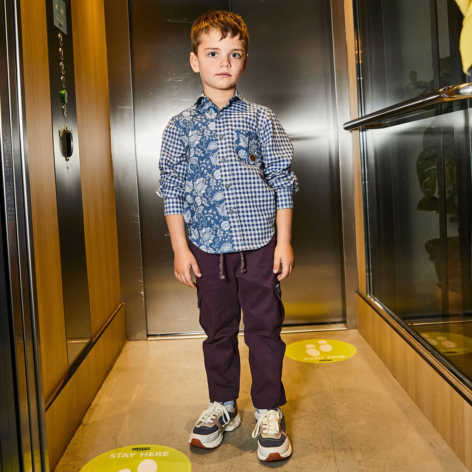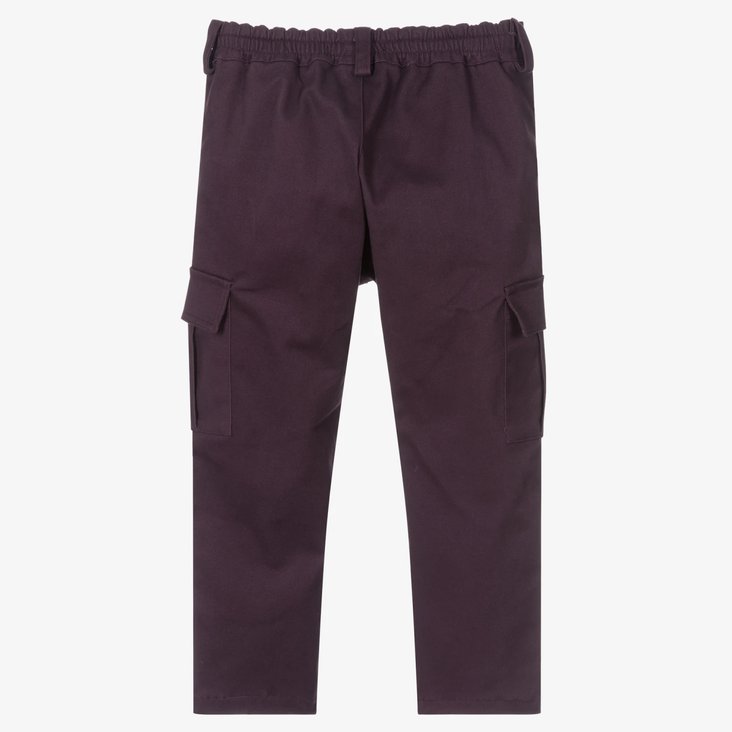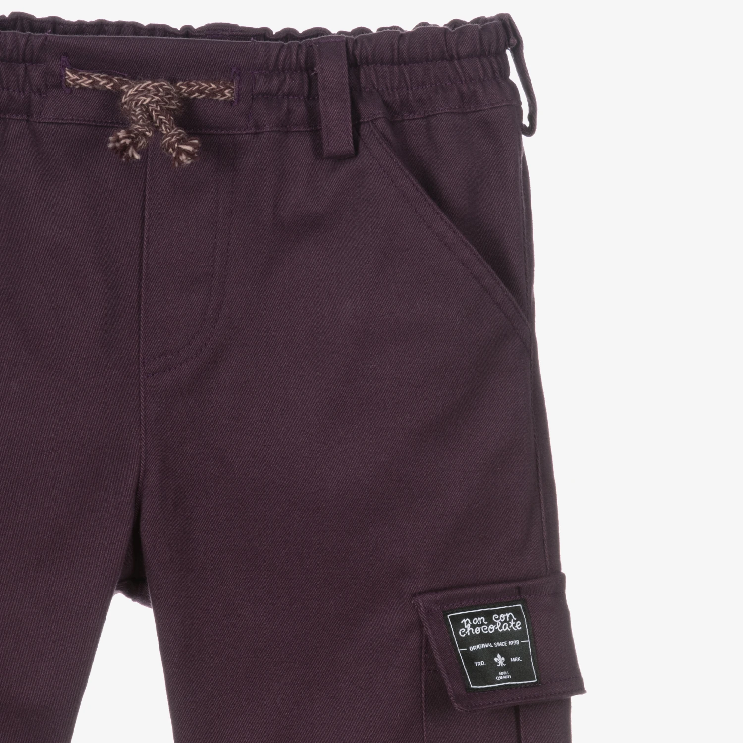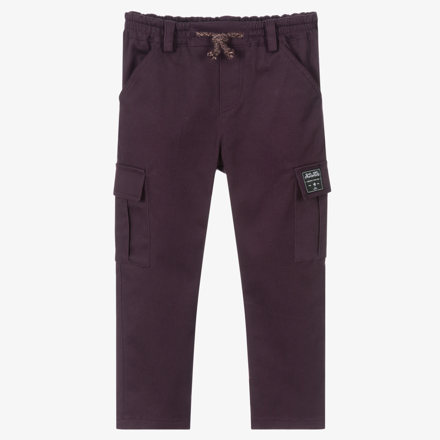 Dark purple trousers for boys by Pan Con Chocolate, made in mid-weight cotton twill. These cargo-style trousers have a comfortable elasticated waist with a faux drawstring. They have two slanted front pockets and two cargo pockets, one with a black logo patch.