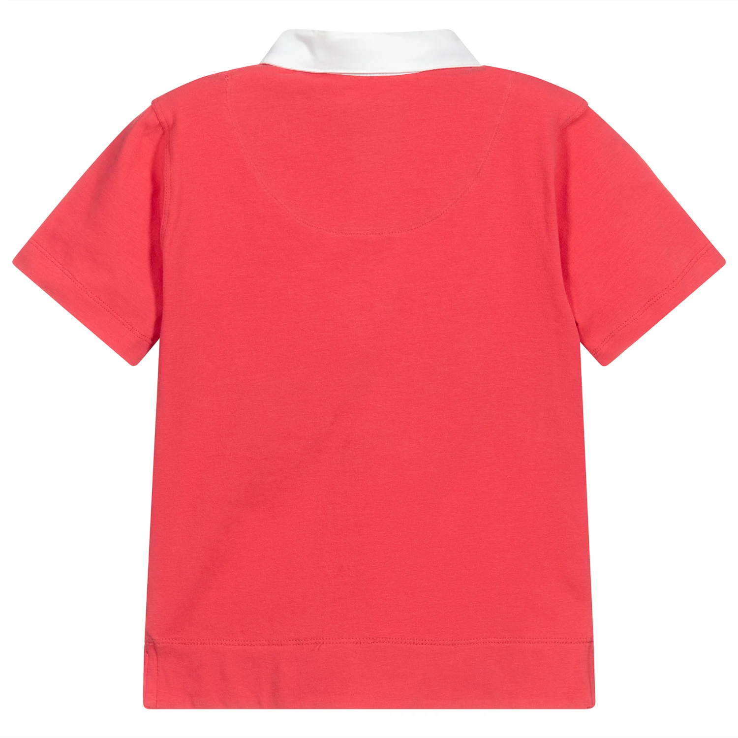 Boys pink-red polo shirt by Pan Con Chocolate, made in soft cotton jersey. It has white and grey inserts, with a white twill collar.