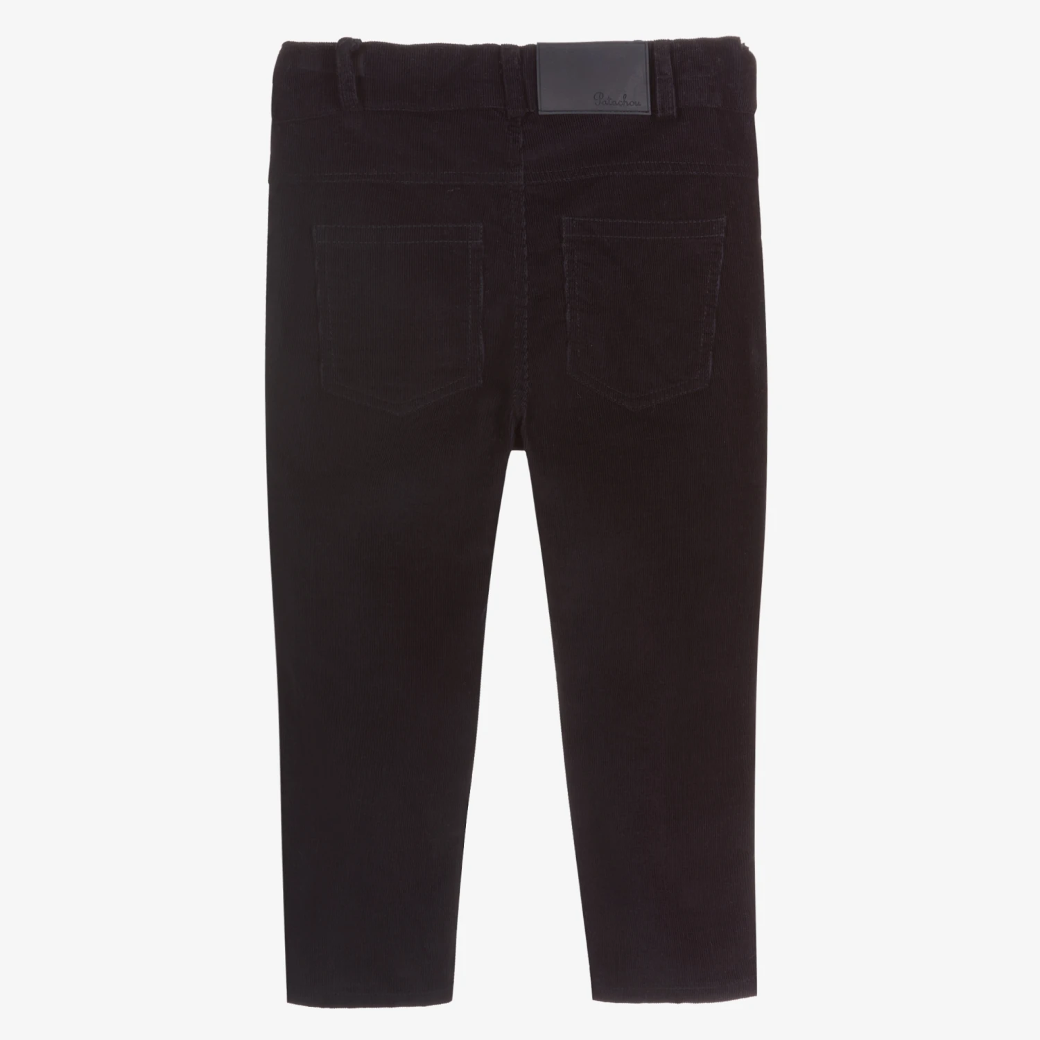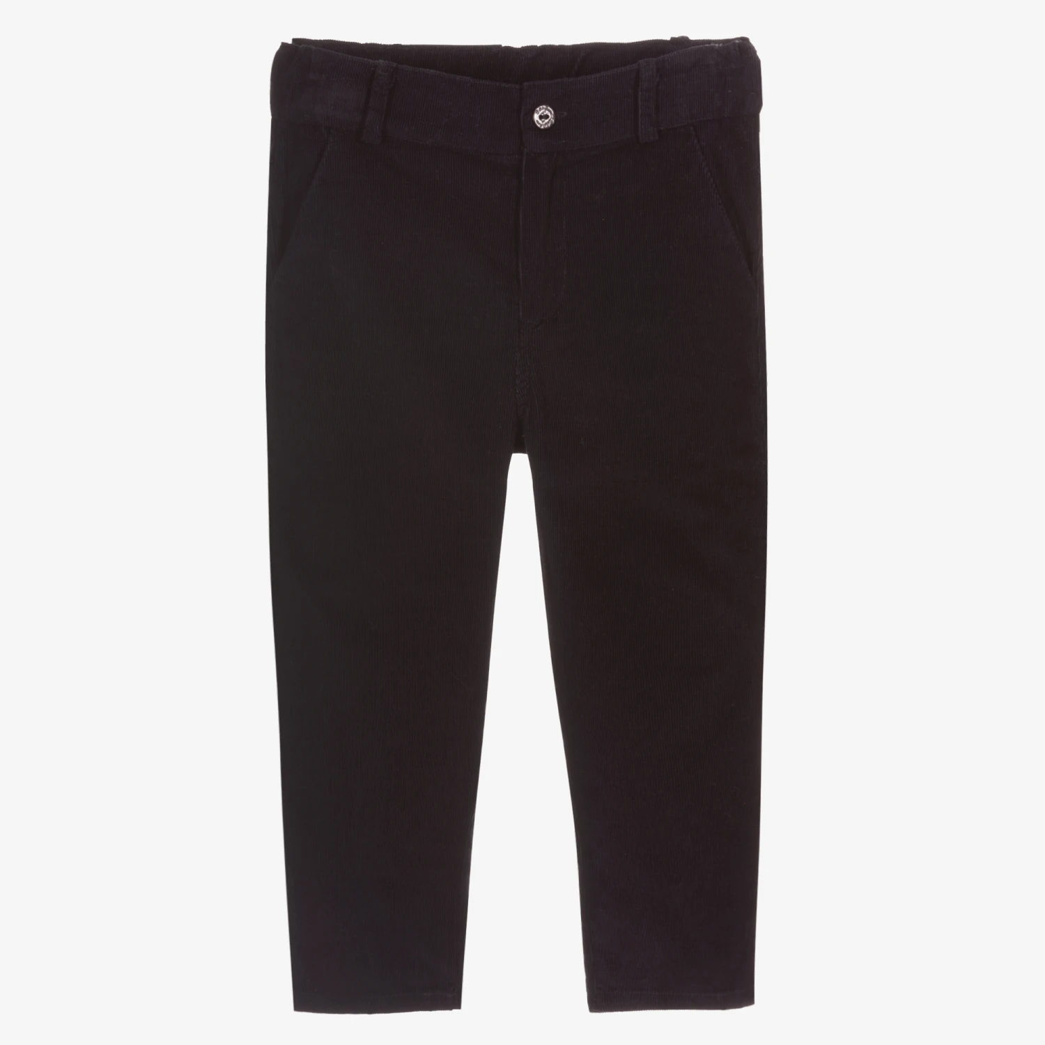 Cool navy blue trousers for boys by Patachou, made in soft cotton needlecord. With a useful adjustable waist, they fasten with a zip and button and have back pockets and slanted front pockets.