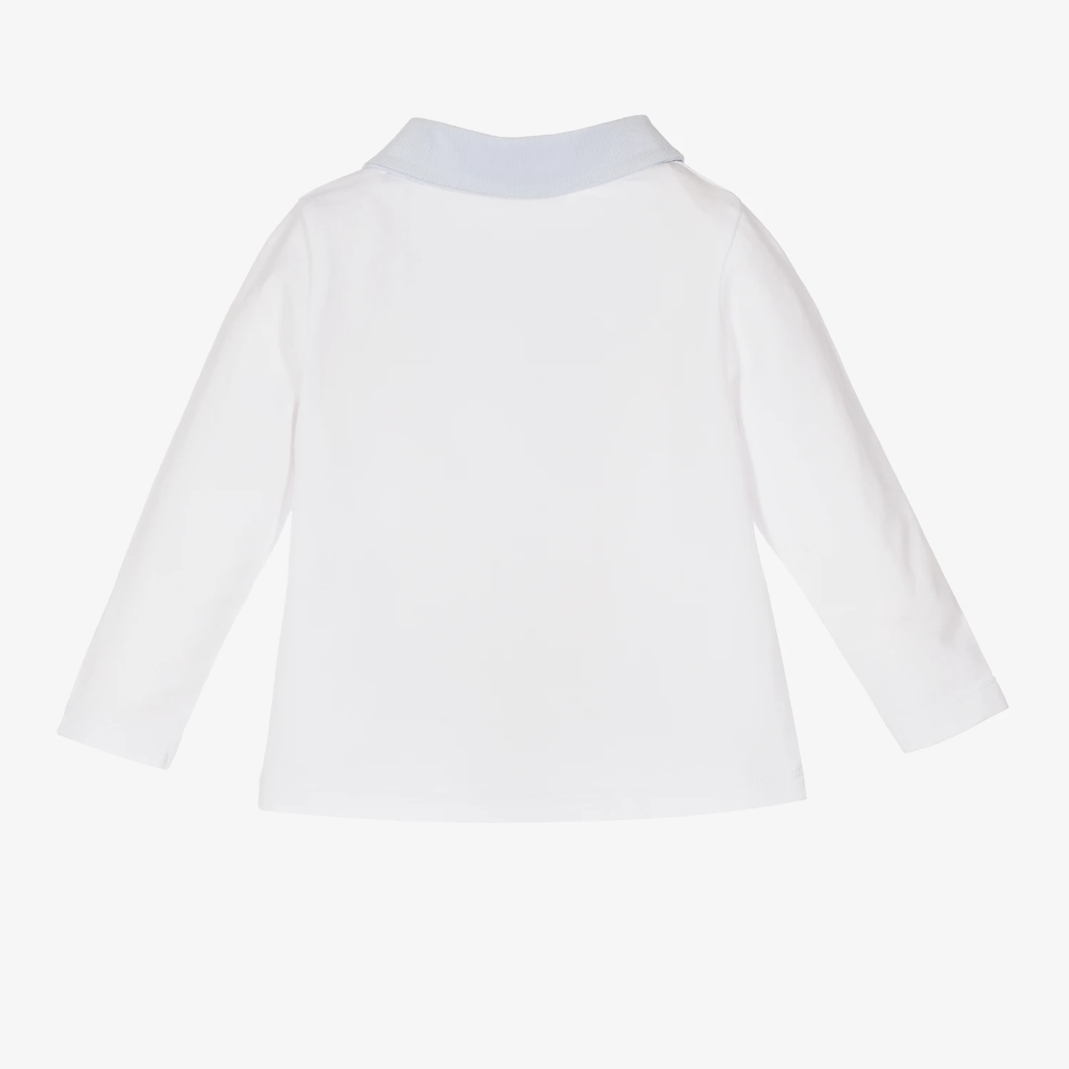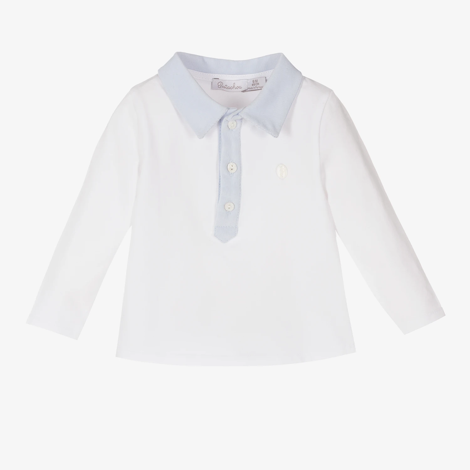 White cotton polo shirt for little boys by Patachou. Made in soft cotton jersey, it has a pale blue collar and button placket in soft, fine corduroy, with branded button fastenings. There is a little logo charm stitched on the chest.