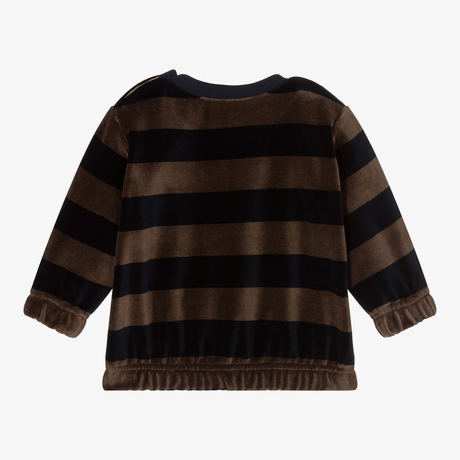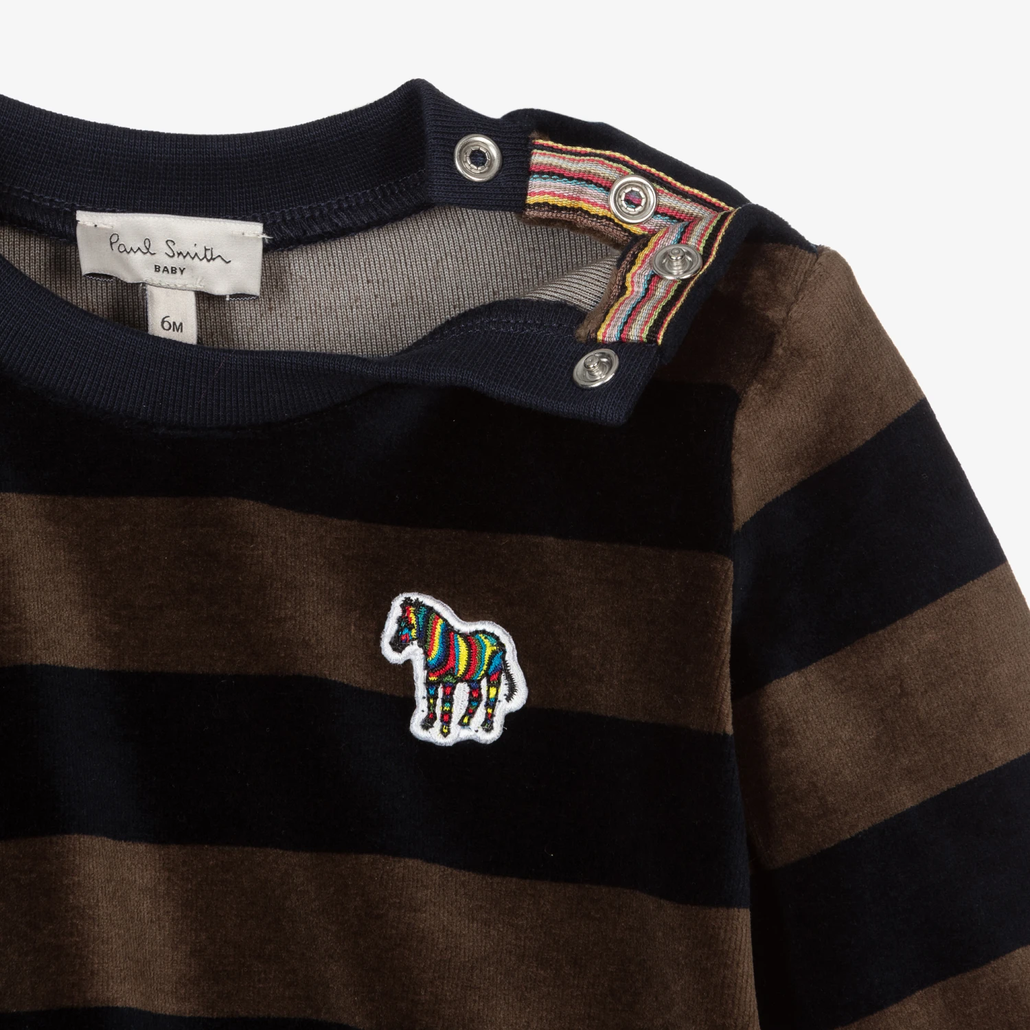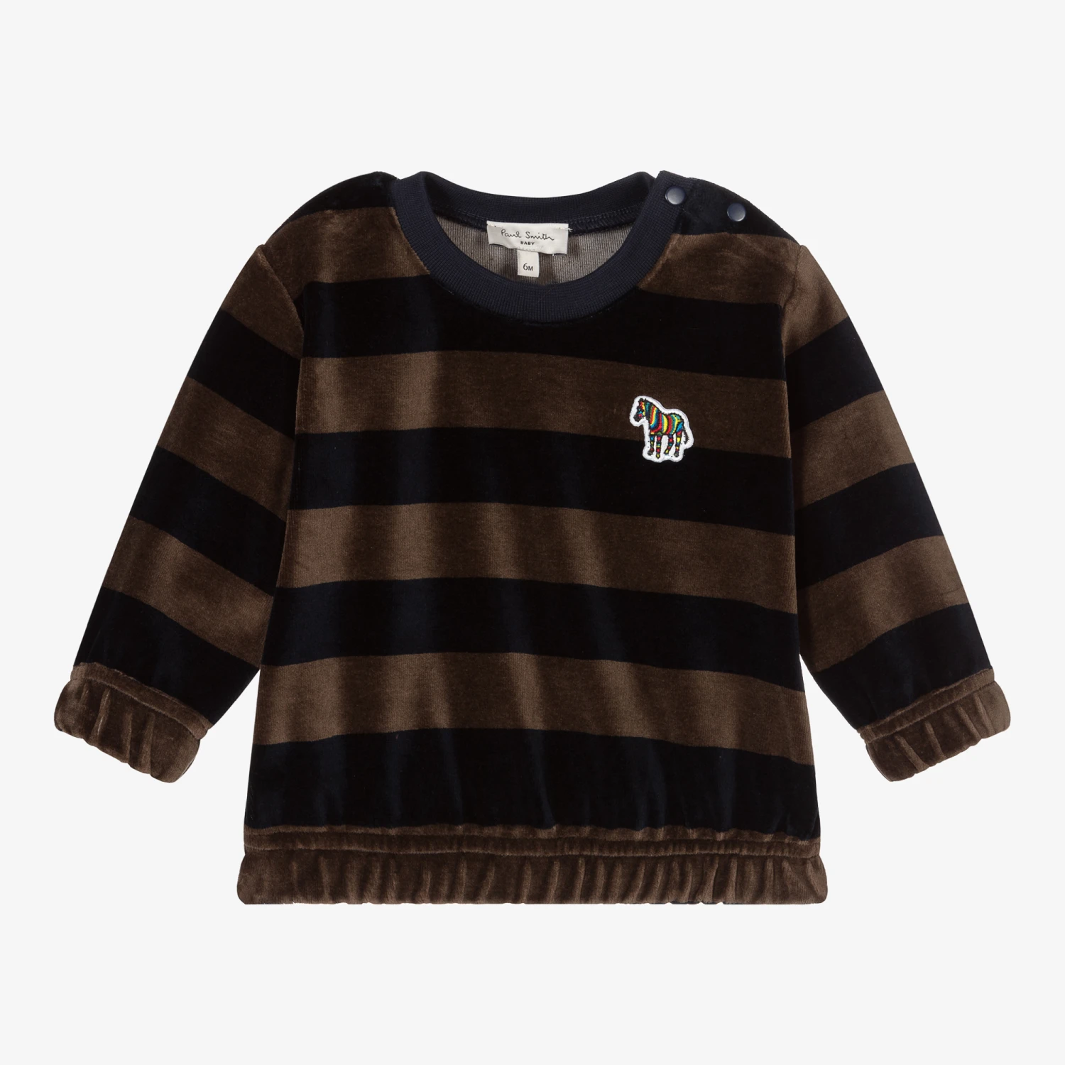 Little boys navy blue and brown-grey striped sweatshirt from Paul Smith Junior, made in soft cotton velour. It has the iconic Zebra logo badge on the chest and popper fastenings on one shoulder. The hem and cuffs are elasticated and the crew neckline is ribbed.