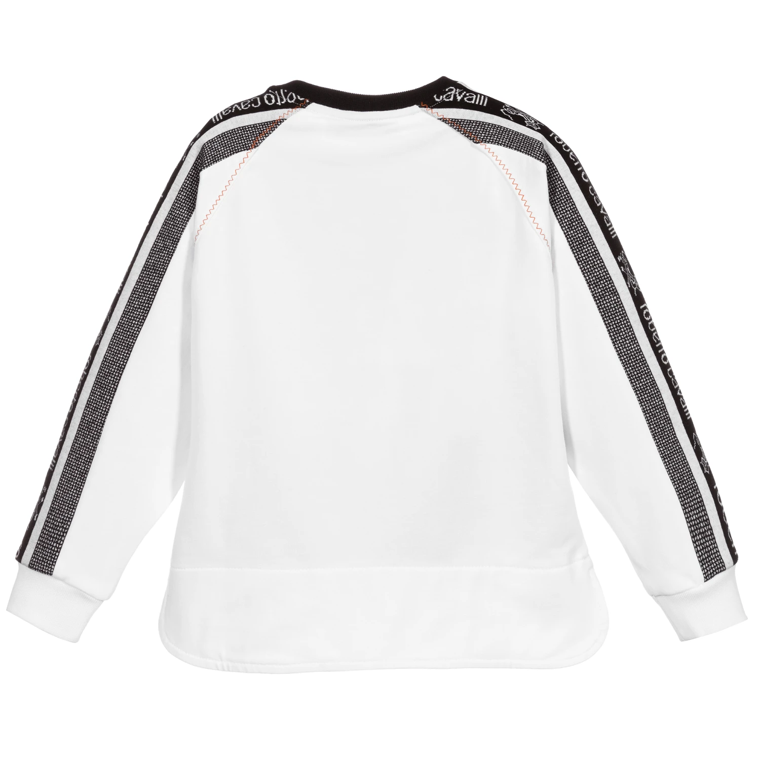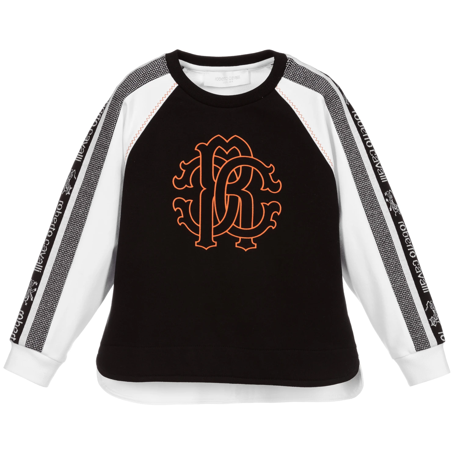 Black and white cotton jersey sweatshirt for boys by luxury brand Roberto Cavalli. It has black logo tape down the sleeves, and an orange ‘RC’ Monogram logo on the front.