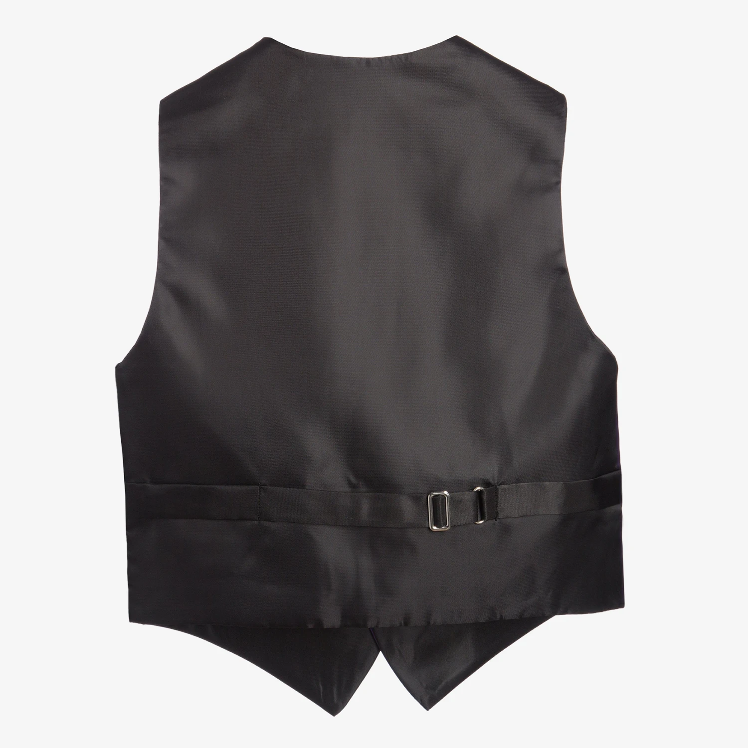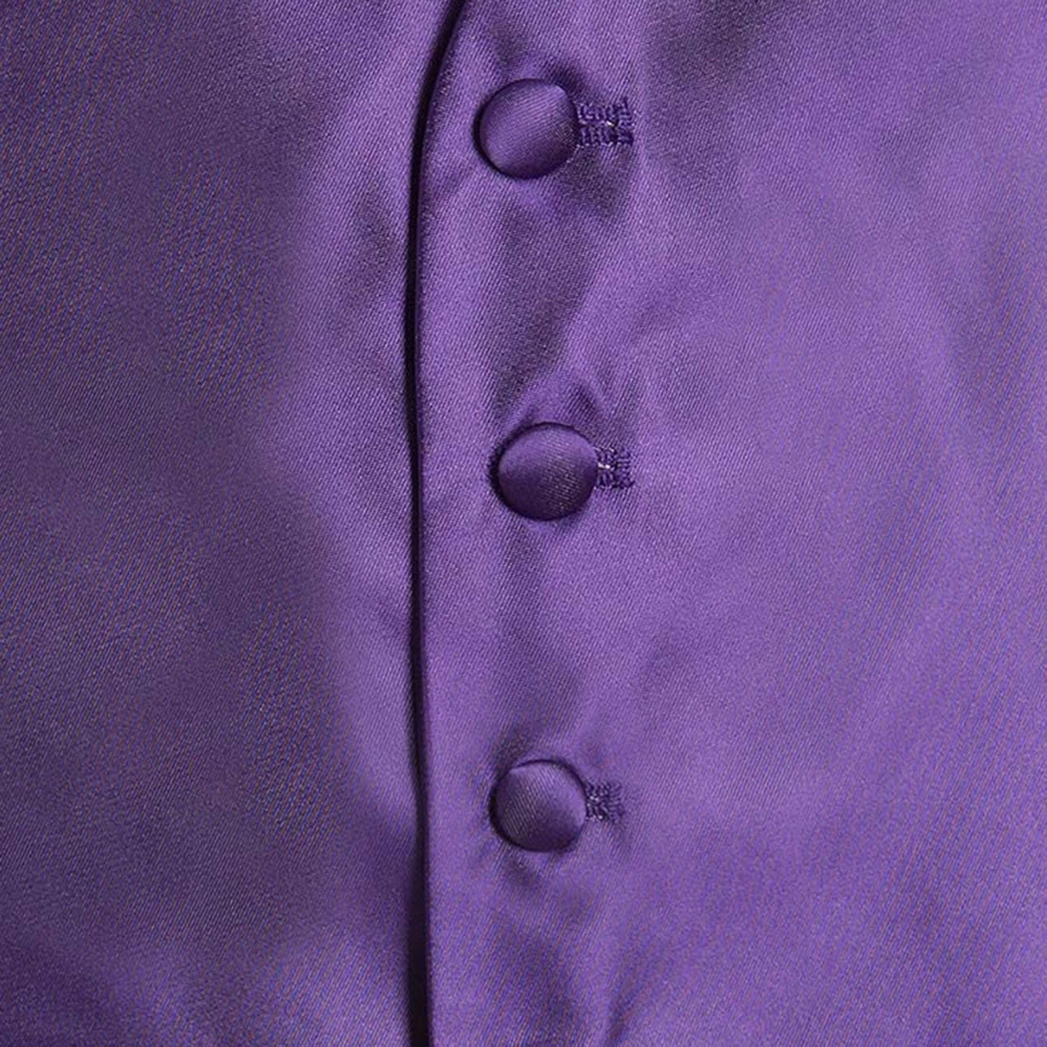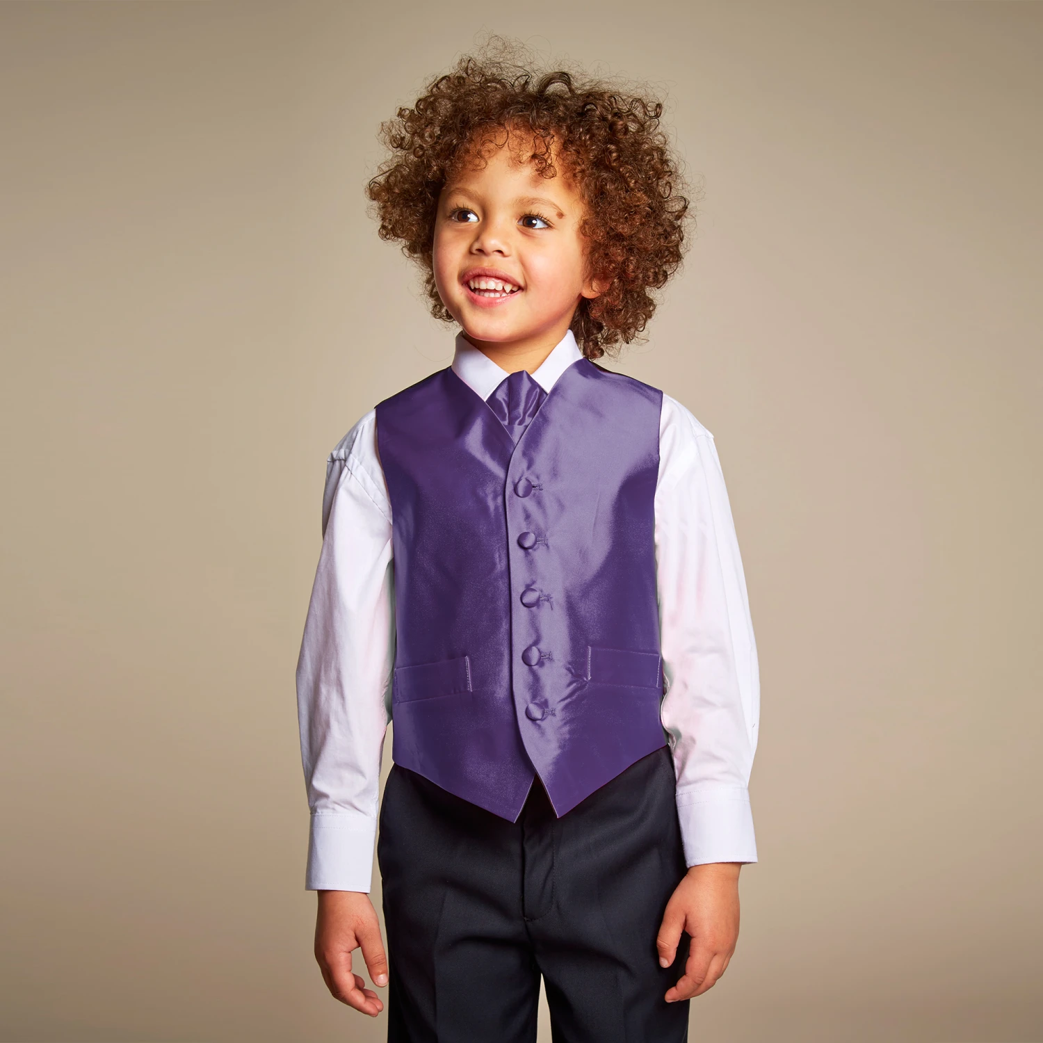 Boys purple satin waistcoat and adjustable tie set by Romano Vianni. Made in a smooth silky fabric, this classic style waistcoat has covered buttons, two faux front pockets and a contrasting back panel in black with adjustable buckle. The matching cravat style tie is ready made and has an adjustable neck strap.