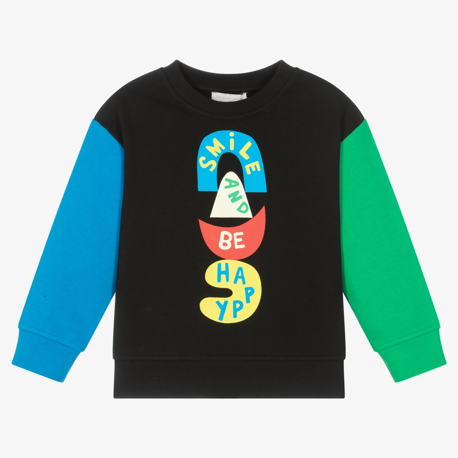 Black colourblock sweatshirt for boys by Stella McCartney Kids, made in organic cotton jersey. Cosy and comfortable to wear, it has an inspiring slogan print on the front with bright blue and green colourblock sleeves. Soft with a fleecy inside, it has dropped shoulders and gently ribbed trims for casual wear.