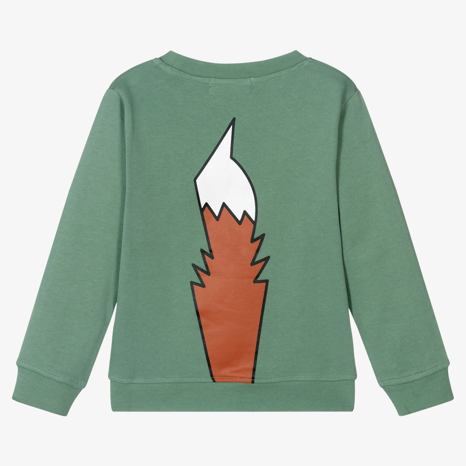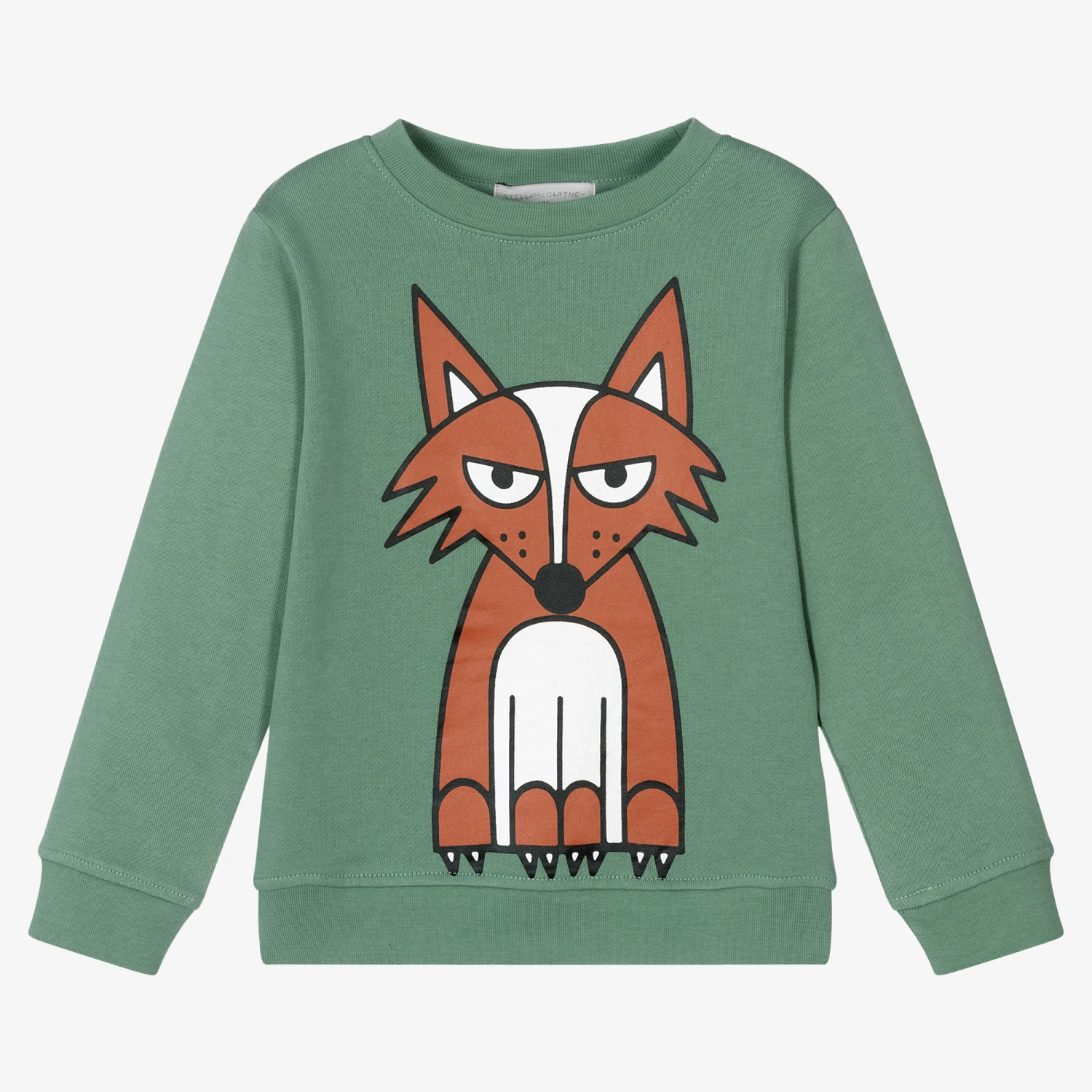 Boys green sweatshirt by British brand, Stella McCartney Kids. Made in comfortable organic cotton sweatshirt jersey with a soft brushed feel inside, it is printed on the front and back with a fun brown fox design.