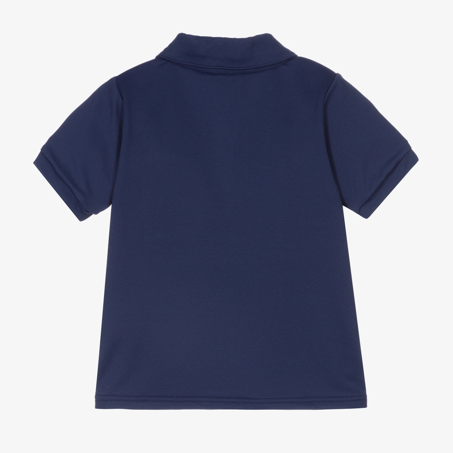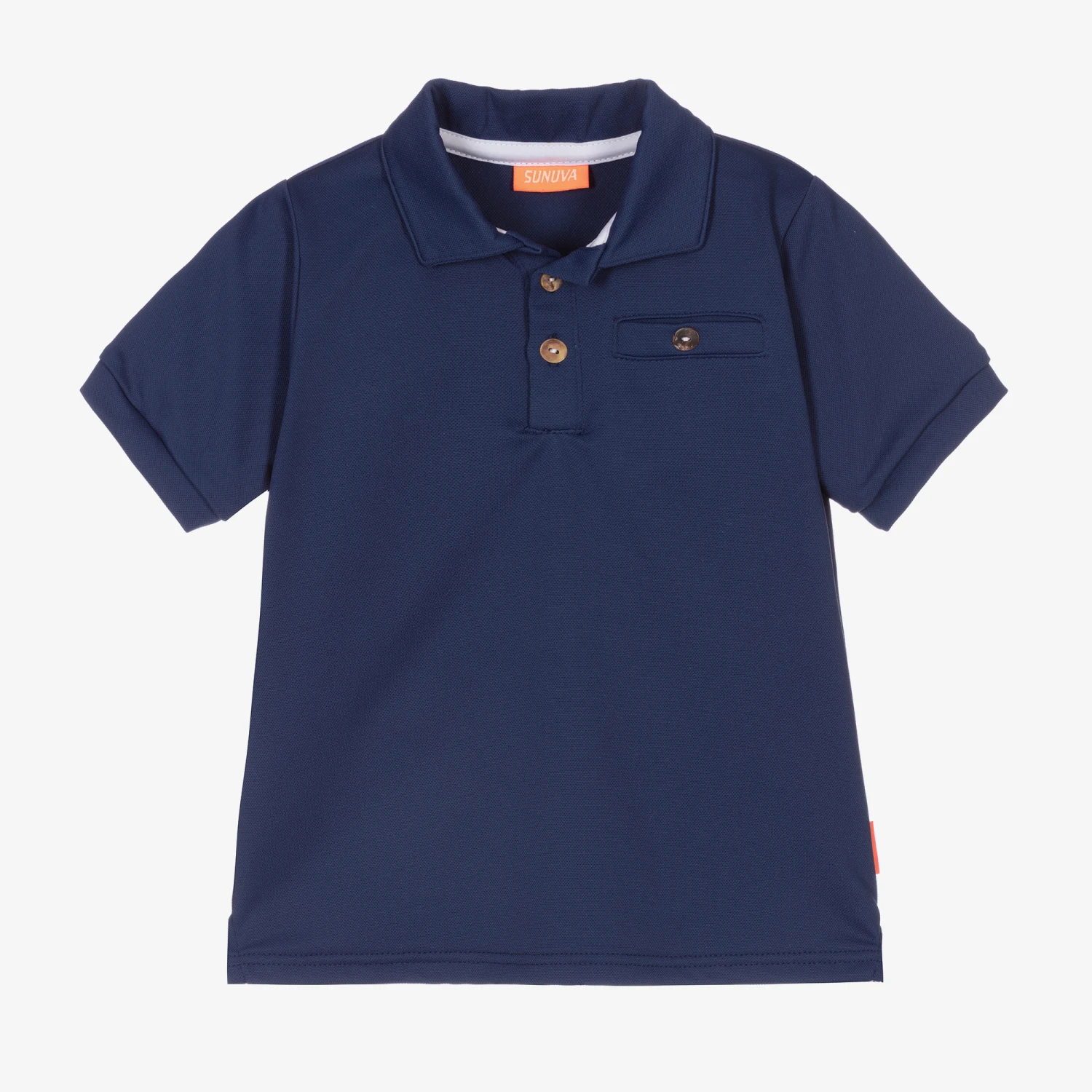 Navy blue piqué polo shirt for boys by Sunuva, made with stretchy nylon. Ideal as a beach cover-up, this sun protective top has mother-of-pearl buttons on the front and faux pocket. There is a neon coral orange logo tab and vents on the sides.