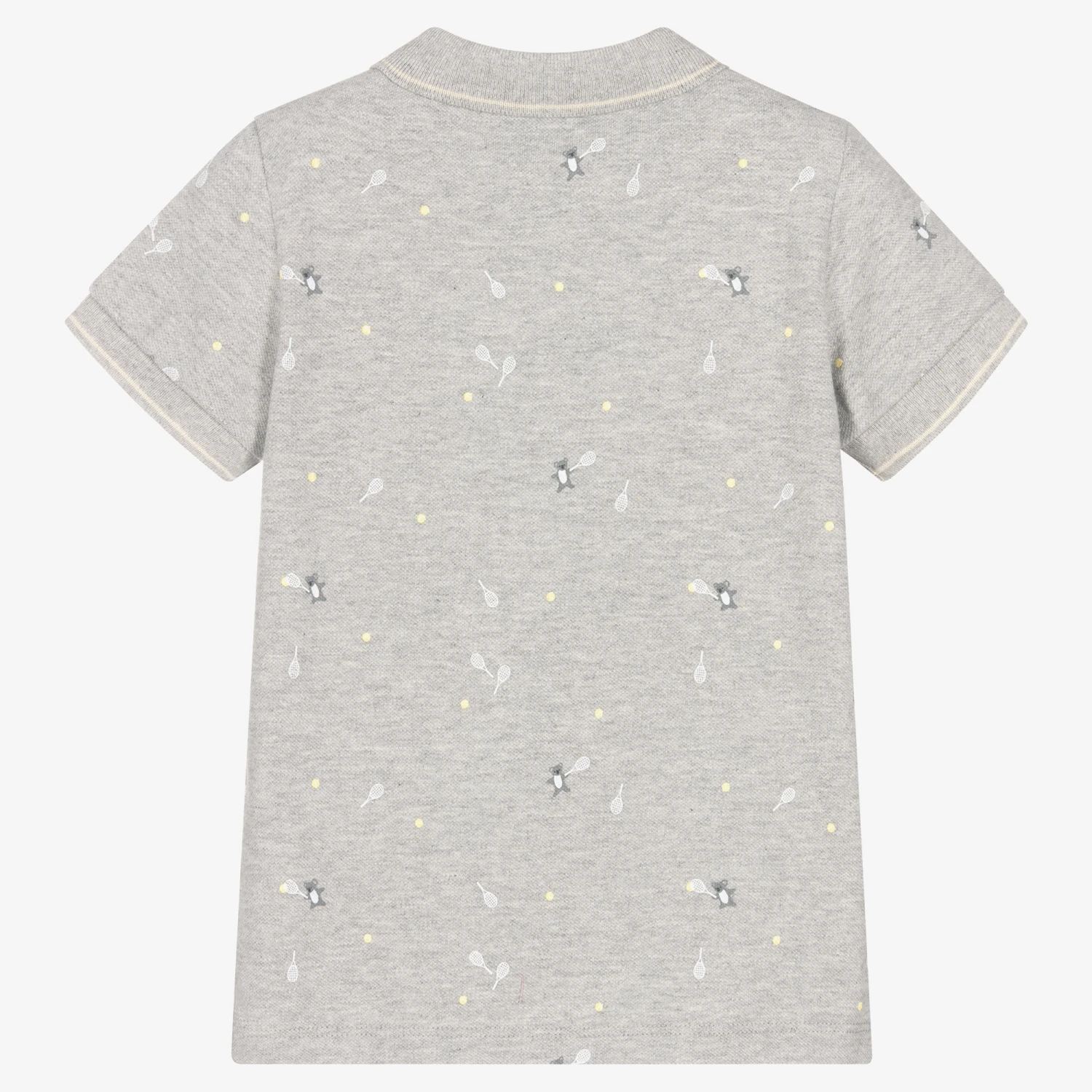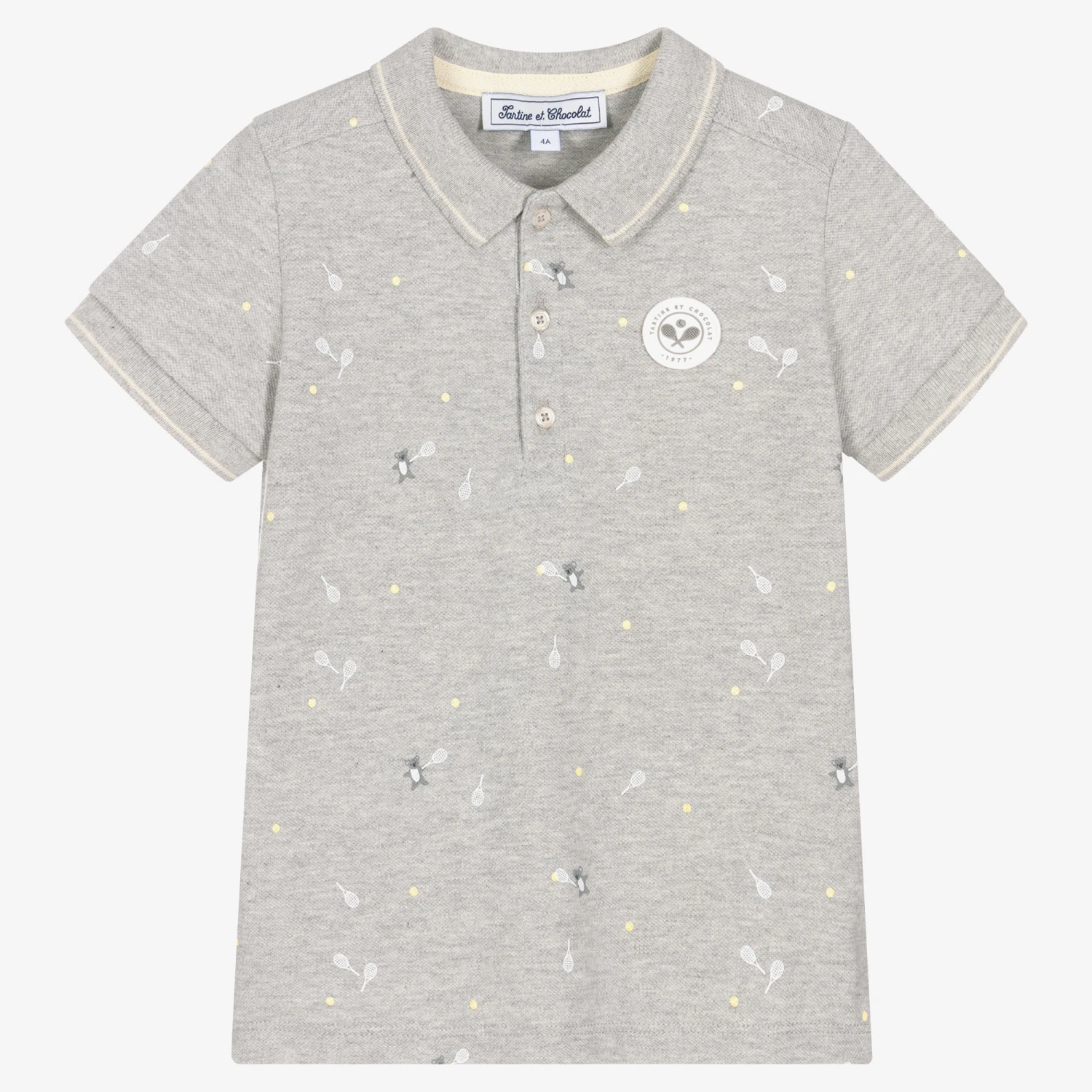 Grey polo shirt for boys by Tartine et Chocolat, made in soft and stretchy cotton piqué. Cool and comfortable, it has a white all-over tennis-themed design and a rubberised logo patch on the chest. There are white striped trims on the ribbed collar and cuffs and logo-branded button fastenings on the front.
