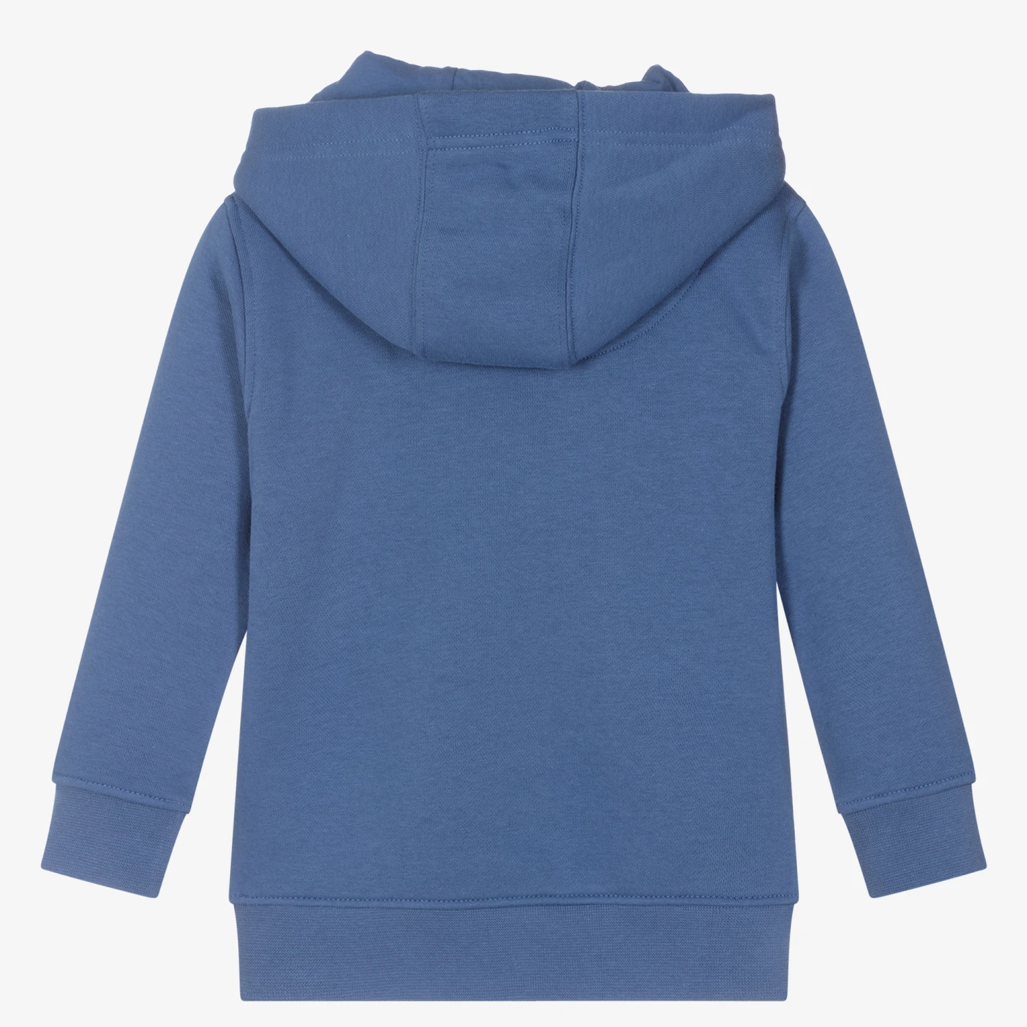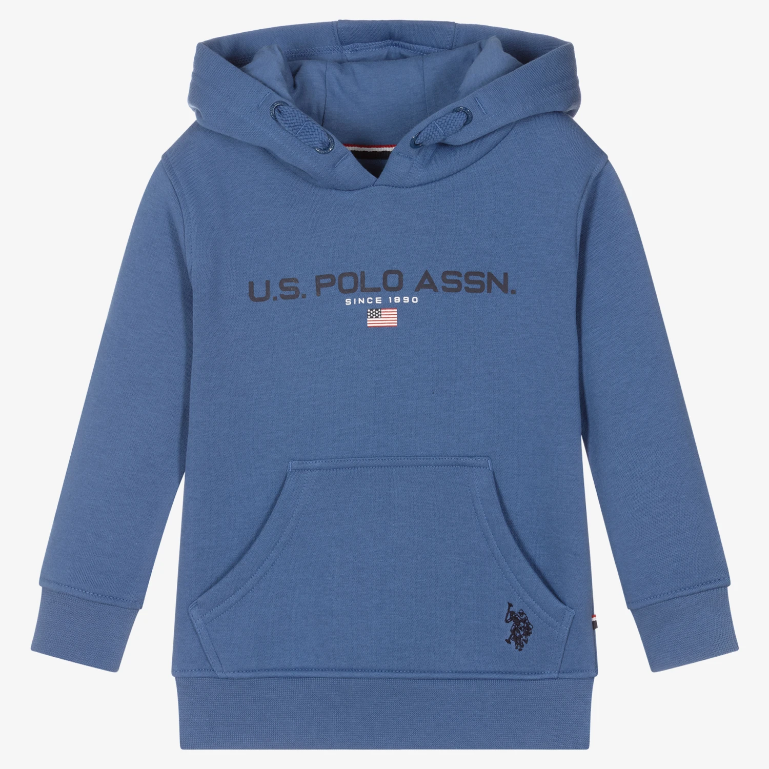 Boys blue hooded sweatshirt by U.S. Polo Assn., made in soft cotton jersey with a warm fleecy inside. It has a navy blue logo print across the chest, with a double horseman logo embroidered on the pouch pocket. There is faux drawstring detailing on the hood.