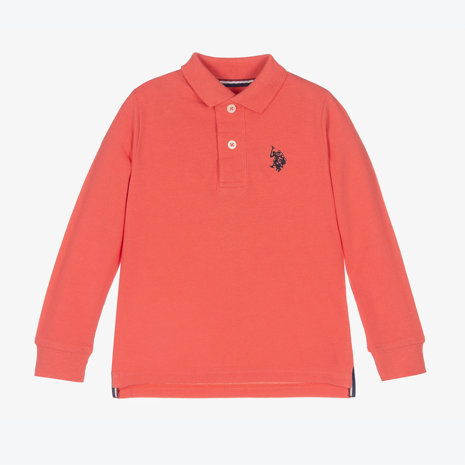 Boys coral orange polo shirt from U.S. Polo Assn., made in soft cotton piqué. This long-sleeved style has navy blue logo embroidery on the chest and branded button fastenings.