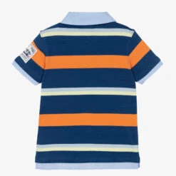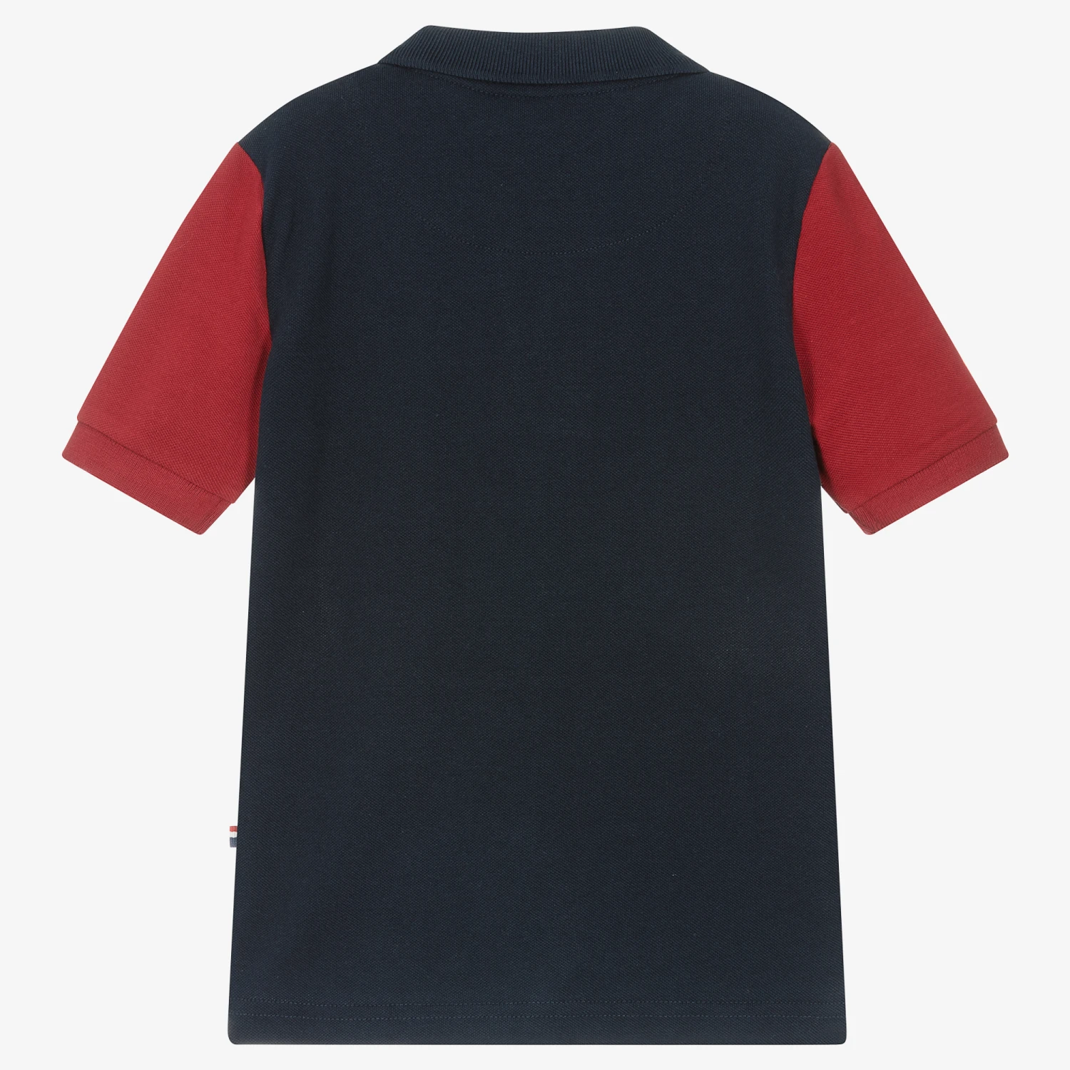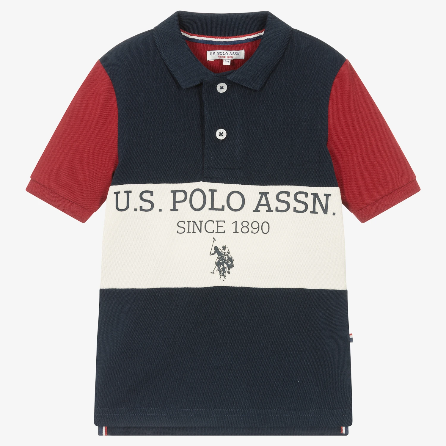 Navy blue cotton polo shirt for boys from U.S. Polo Assn., with contrasting dark red sleeves and a white logo panel across the front. Made in soft and comfortable piqué, it has a classic ribbed crew neck and branded button fastenings on the front.