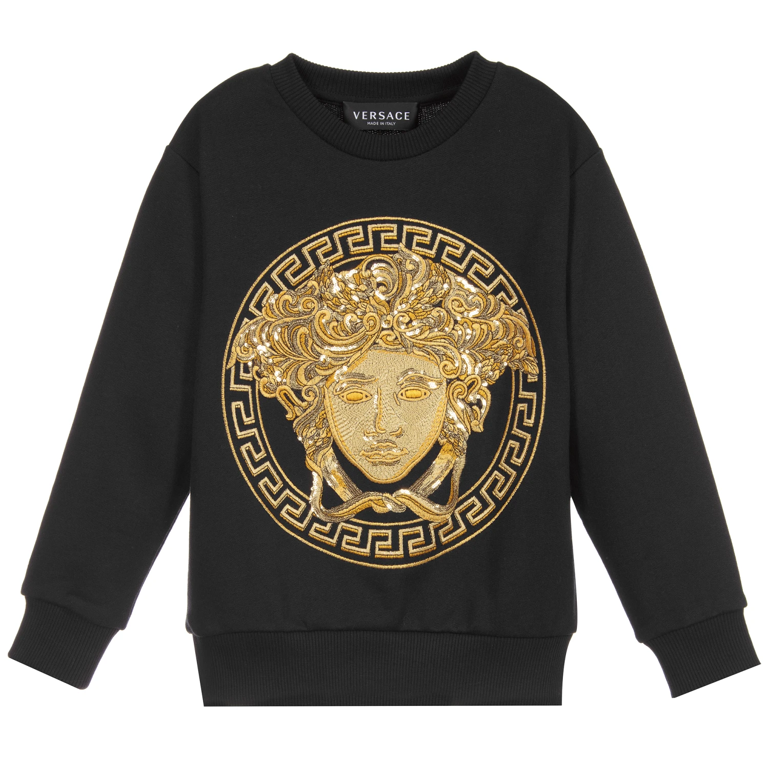 A beautifully soft, black sweatshirt for boys and girls by luxury brand Versace. The iconic Medusa head is embroidered on the front in gold, sparkling with golden sequins.