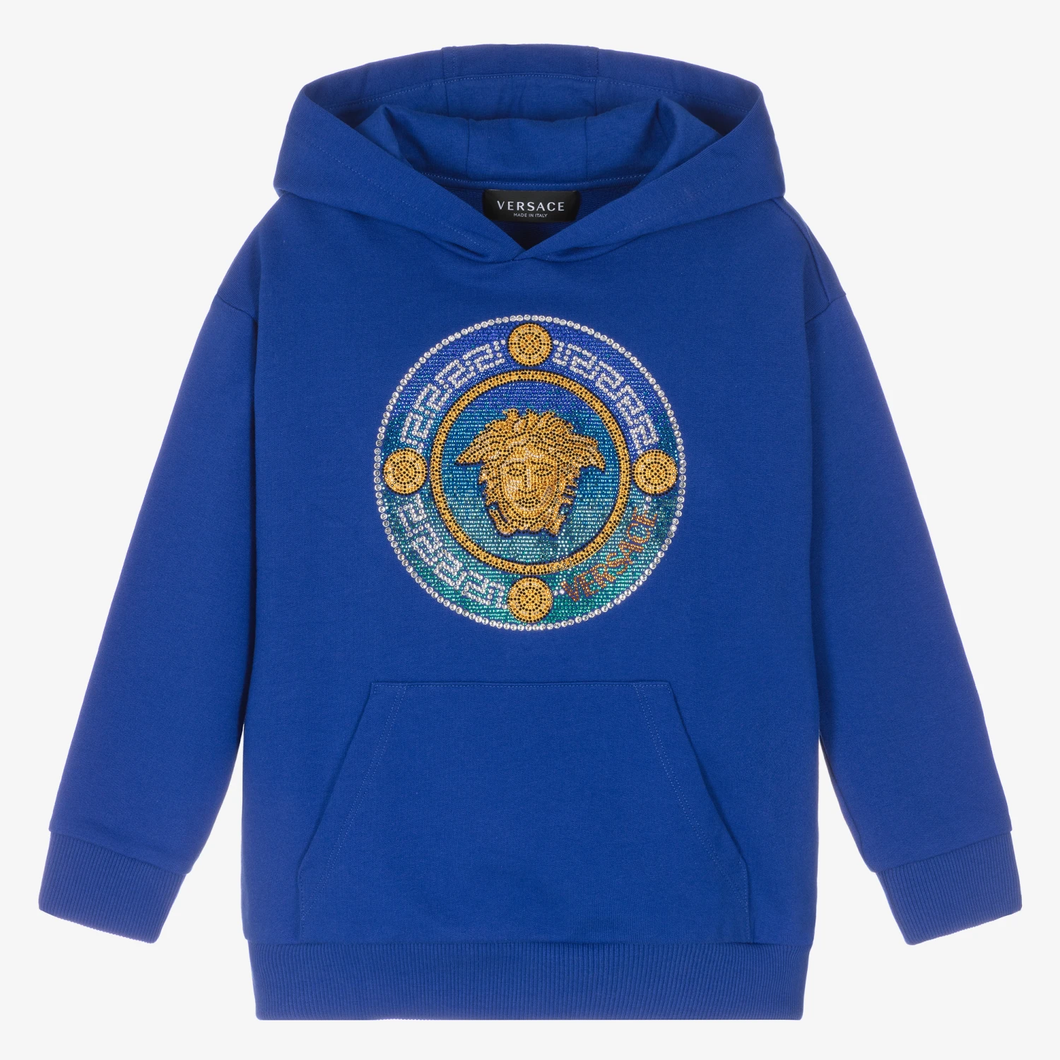 Casual royal blue hooded sweatshirt for boys by luxury fashion house Versace. It features an eye-catching crystal-embellished Medusa motif on the front in gold and blue. Made in mid-weight cotton jersey, this statement top has a useful pouch pocket on the front and ribbed trims for a snug fit.