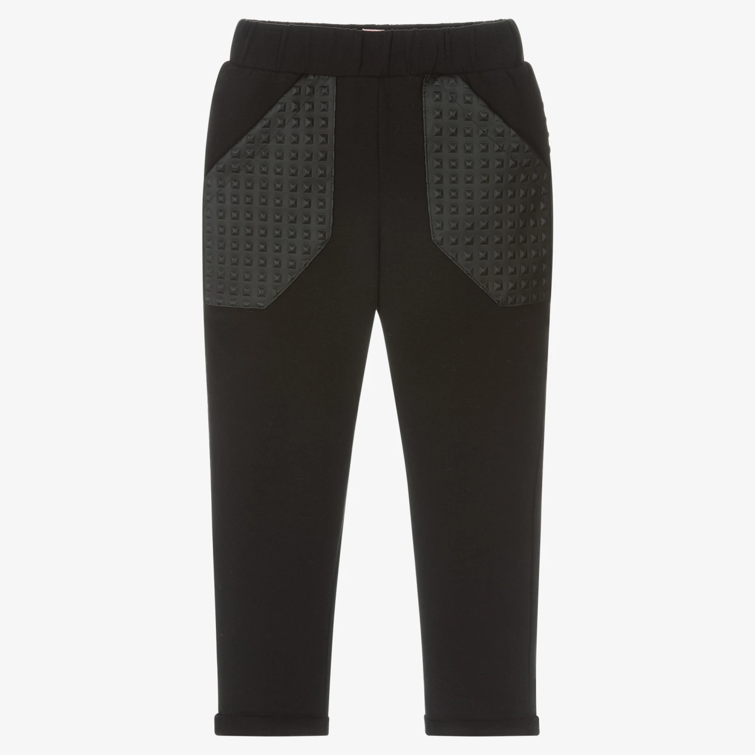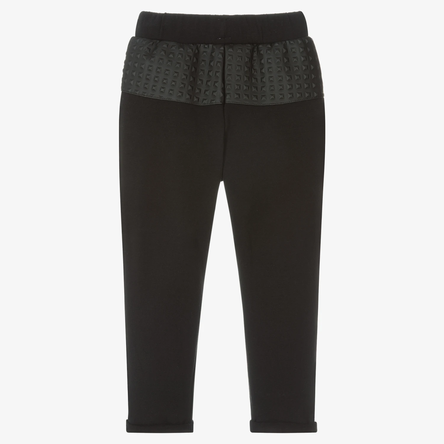Casual black jersey trousers for boys from Wauw Capow by BangBang, made in comfortable organic cotton. They have faux leather patch pockets with pyramid stud detail and matching trim on the back, for a cool and quirky finish. Easy-to-wear, they have an elasticated waistband and turn-up cuffs.