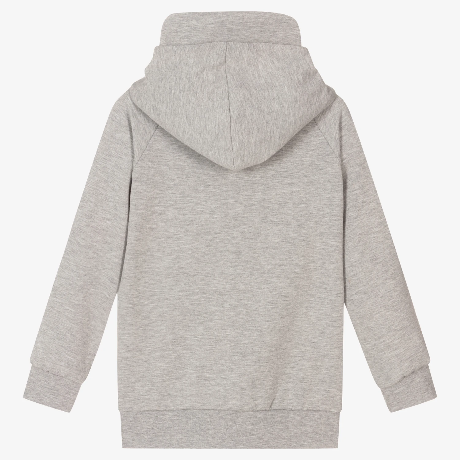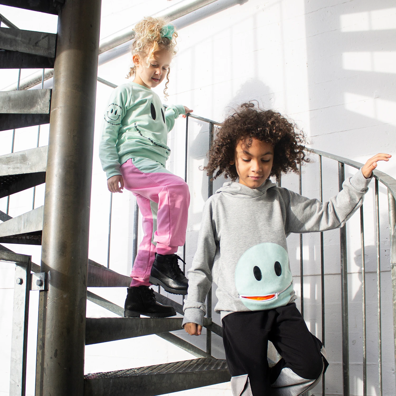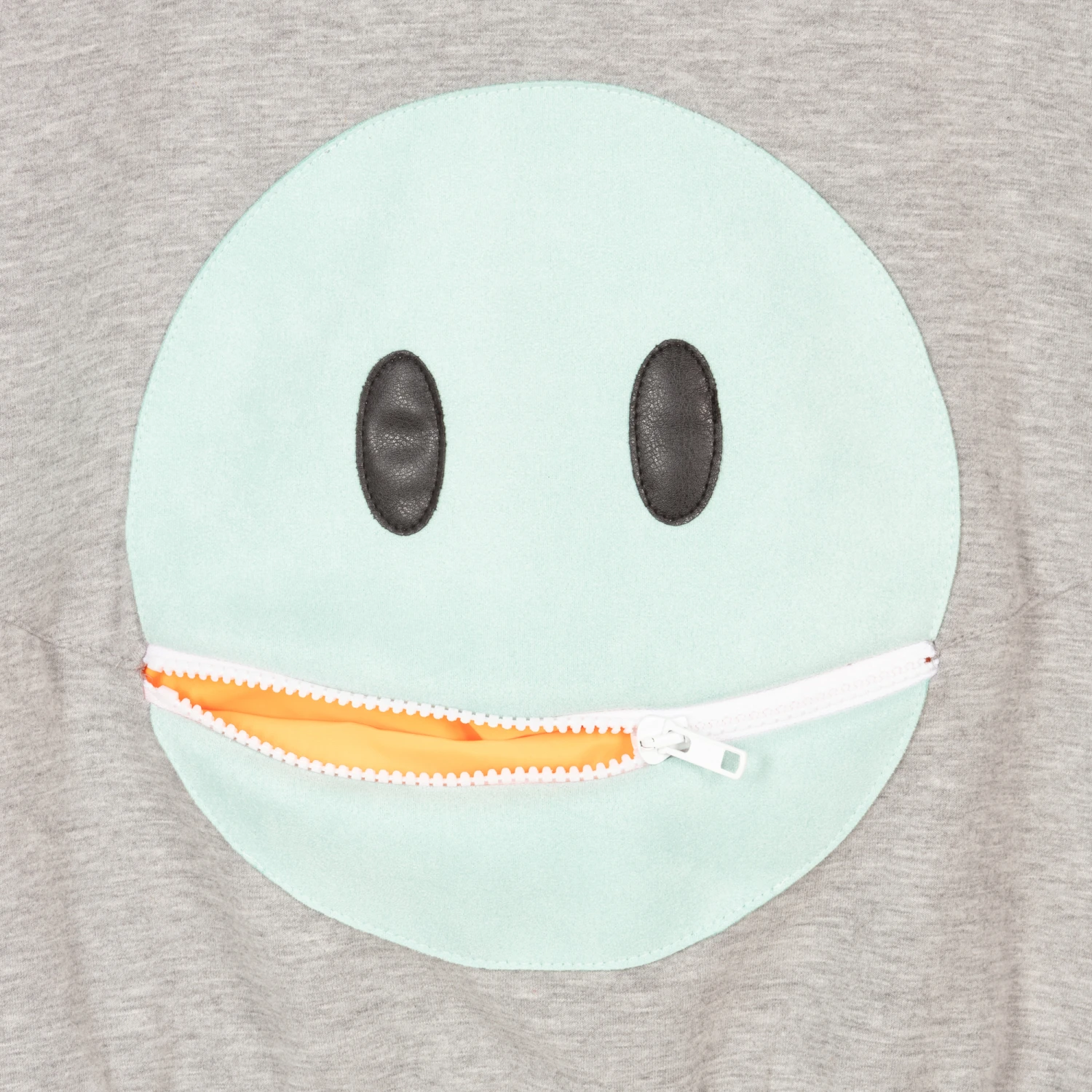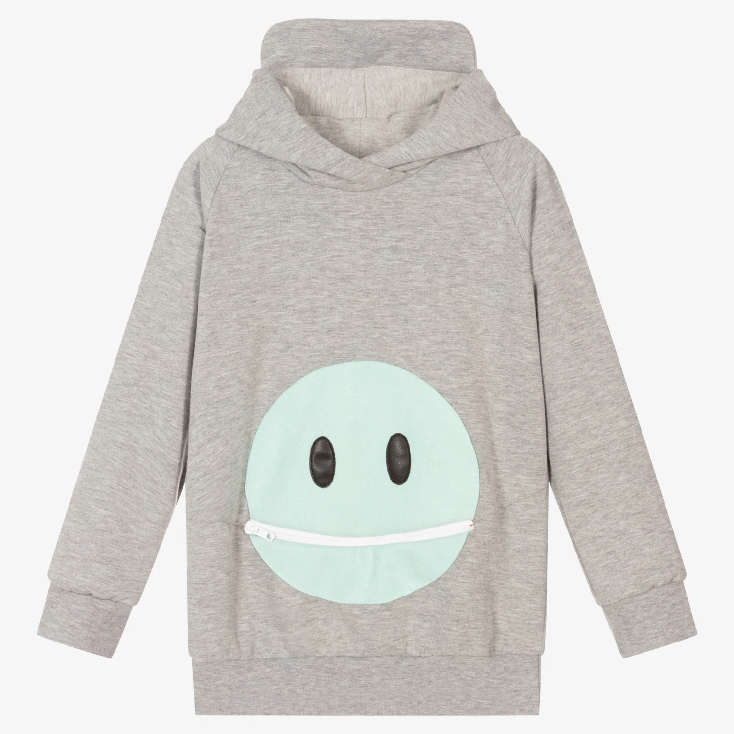 Grey marl hooded sweatshirt for boys and girls from Danish brand Wauw Capow by Bangbang. Cute and quirky, there is a face appliqué on the front, made in turquoise blue faux suede with a white zip-fastening pocket in the shape of a mouth, opening to a neon orange interior. This soft, comfortable hoodie is made in super soft organic cotton blend jersey with a fleecy interior and a peak detail on the hood.
