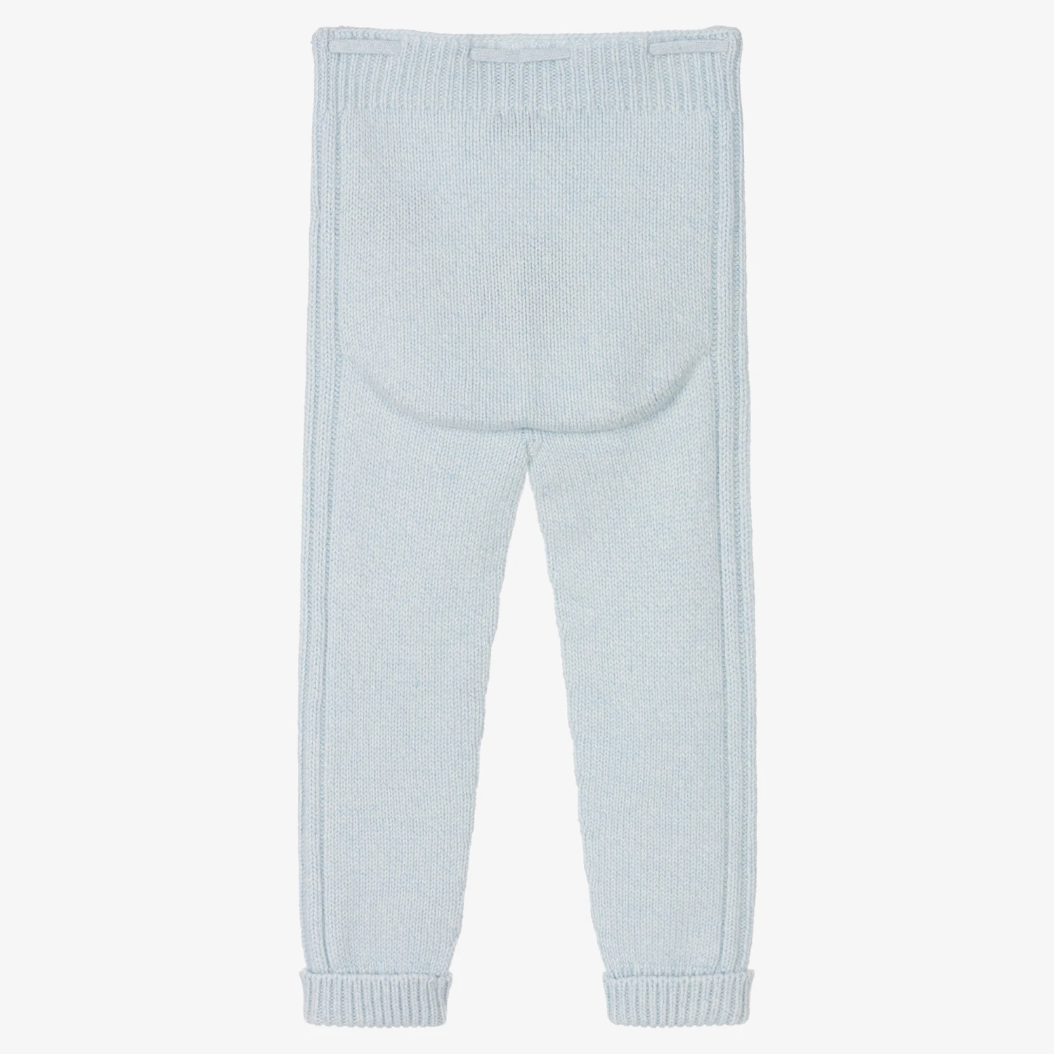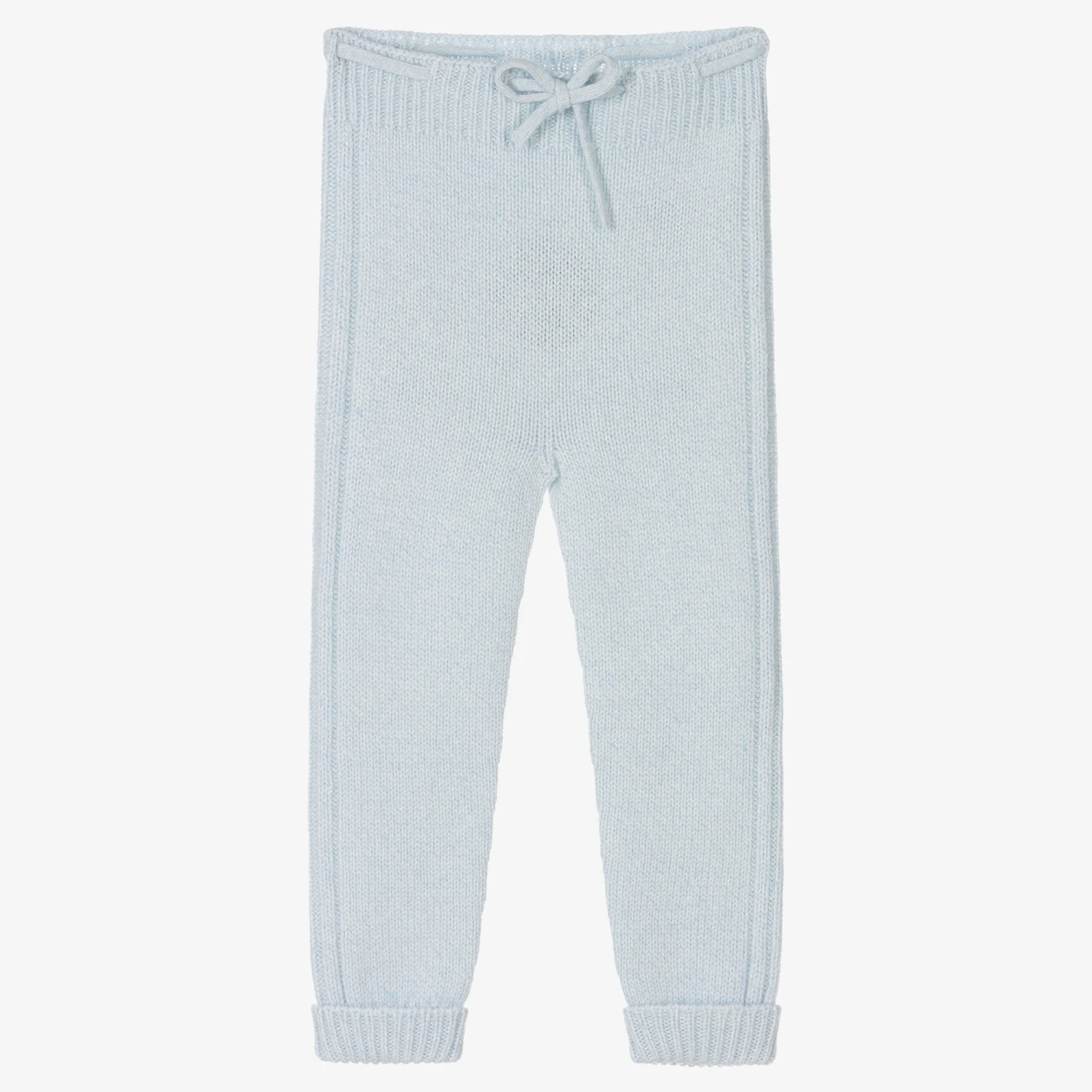 Beautifully soft and comfortable for younger boys and girls, these pale blue knitted trousers are from Wedoble. Made in a cashmere, Merino wool and viscose blend for a luxurious feel and superior warmth, they have a ribbed waistband with a drawstring tie. There are patterned stripes at the sides and they have ribbed turn-up cuffs.